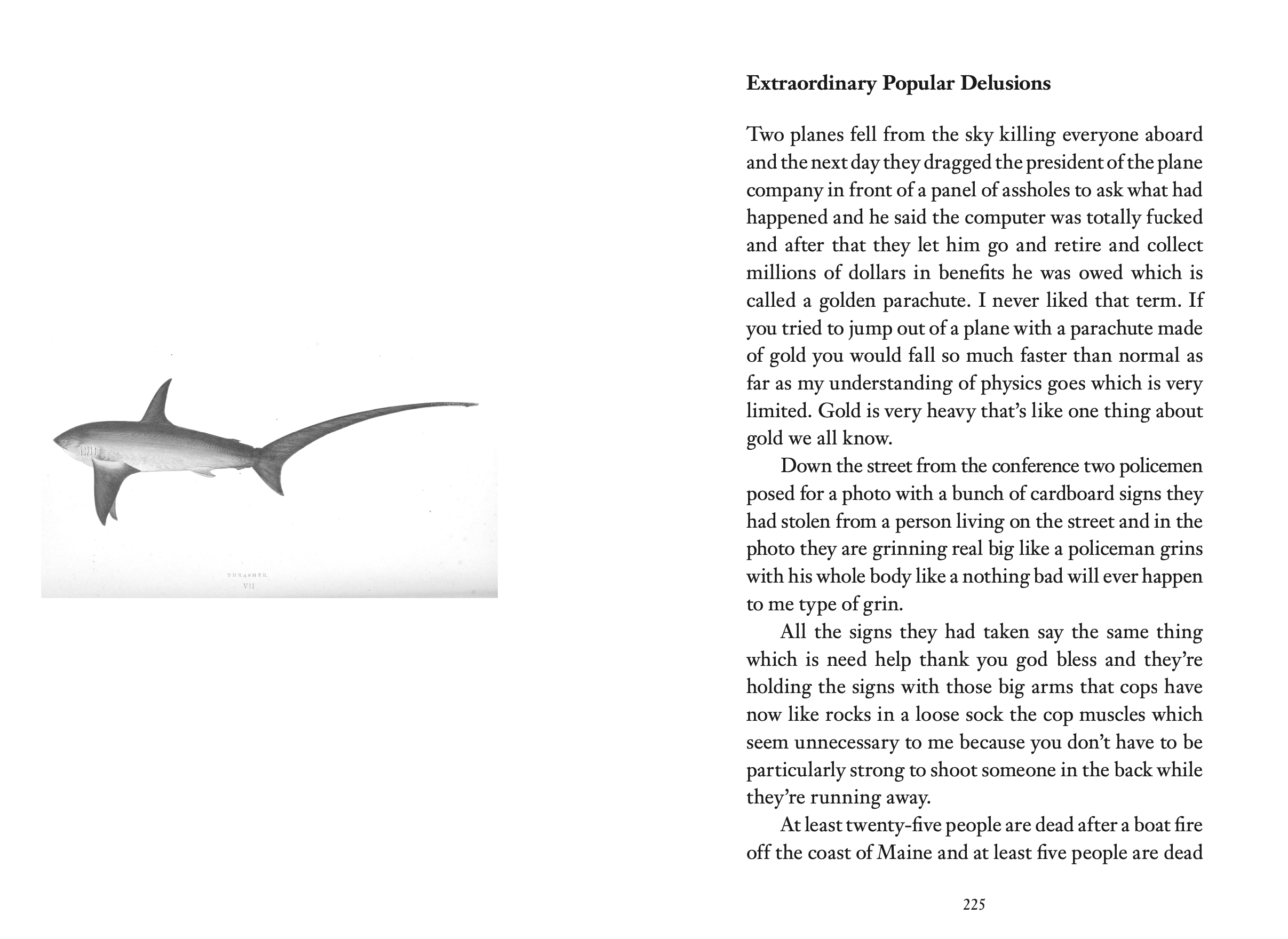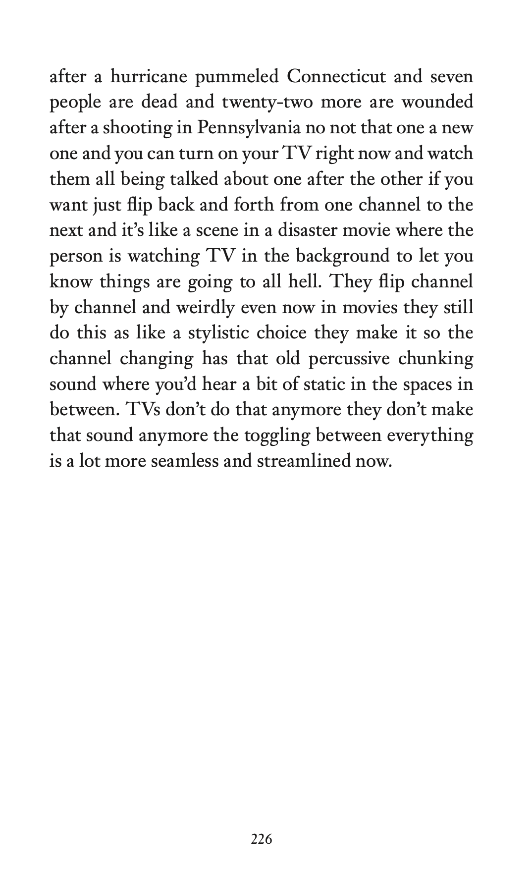 See the ducks down there she said pointing like a child points. The black and white ones she said and he said where and she corrected herself and pointed again like an adult points and he said I guess so I can’t really see without my glasses. Do you want me to go get them for you she said and he said no he said he could go get his glasses himself if it came to it. They’re bobbing under the water she said like penguins she said and he said do penguins do that? Dawning on him now that penguins of course must have to dive down to eat fish or what else were they supposed to live off of otherwise. Certainly no insects swarming about in the Arctic or Antarctic or whichever one penguins lived in. Like warmer birds get to go running around after. Not yet anyway.