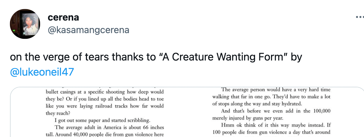 I just wish I knew how to like new things again, instead of being stuck in the comfort of my past. I know my brain is likely just coping with and defending itself from the existential threat that is, well, gestures to everything, but I wish I could find room in my brain and in my heart for something new. It sometimes feels like everything that’s ever been said has already been said 100 times over, so why bother trying to find something that says it in a slightly different way?