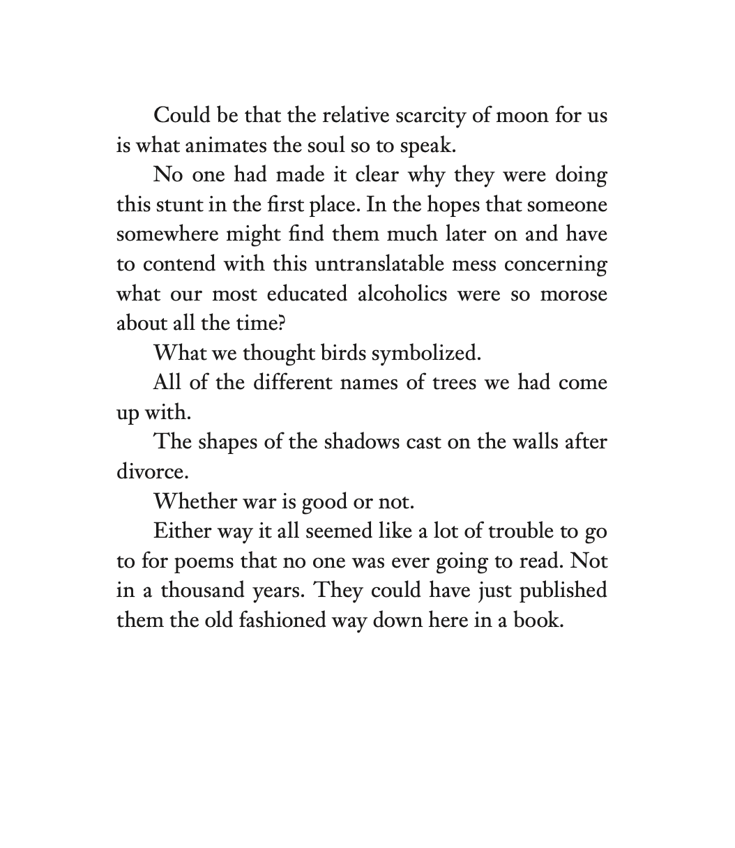 I wonder how long it will take for the fruits of my specific labor to be processed into a neighbor’s anguish? Watch as this brutal machinery transforms the written word into abductions. Something like bureaucratic sublimation. I don’t know if they know how to track that sort of thing and if they ever did they must have fired everyone at that particular agency by now anyway.