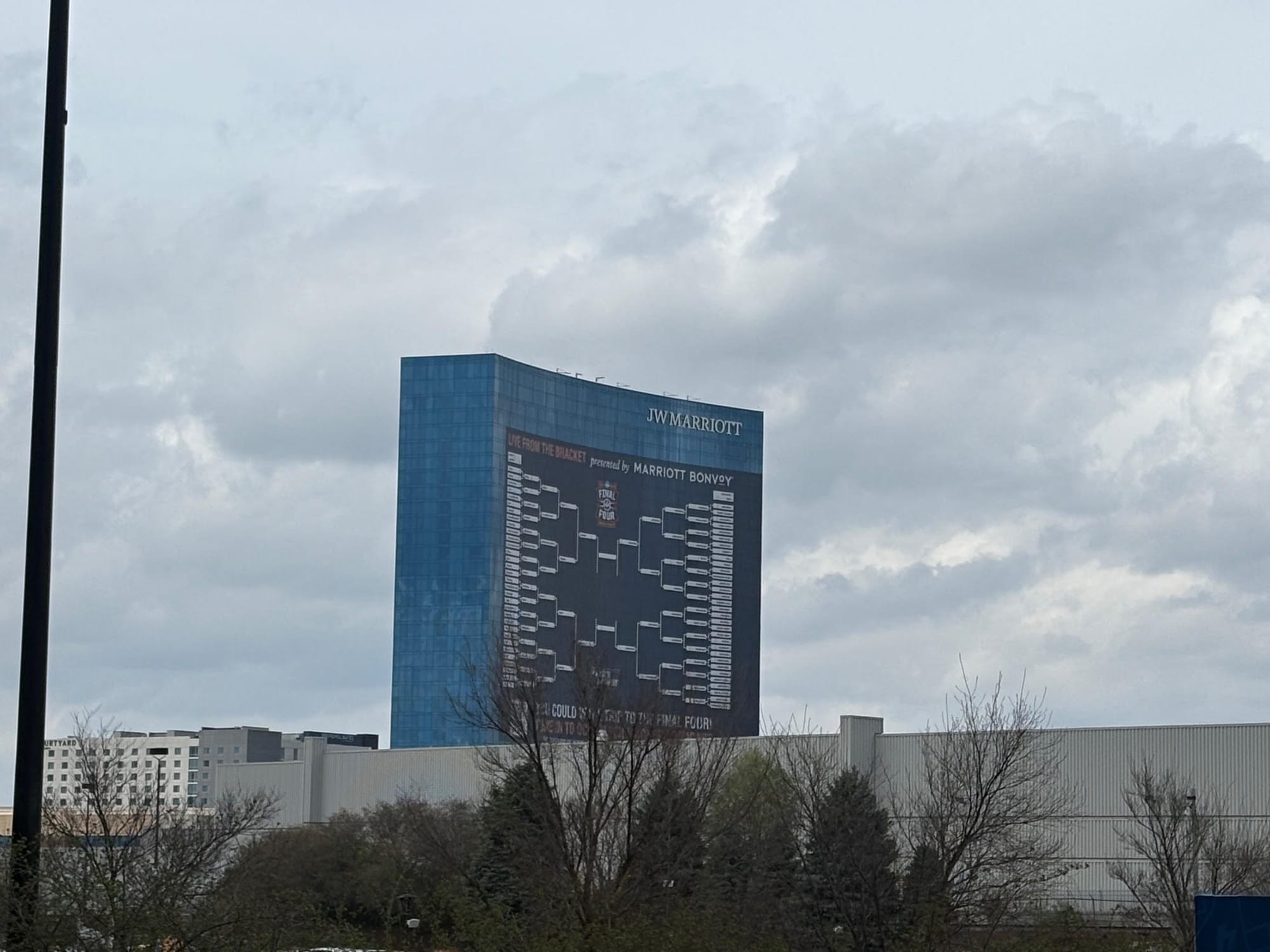 A giant NCAA basketball Tournament bracket looms over downtown Indianapolis, 34 stories high on the facade of the JW Marriott hotel. If you weren’t already aware the Final Four was in town, it would be impossible to avoid it. The bracket is, of course, prominently sponsored by Marriott Bonvoy.