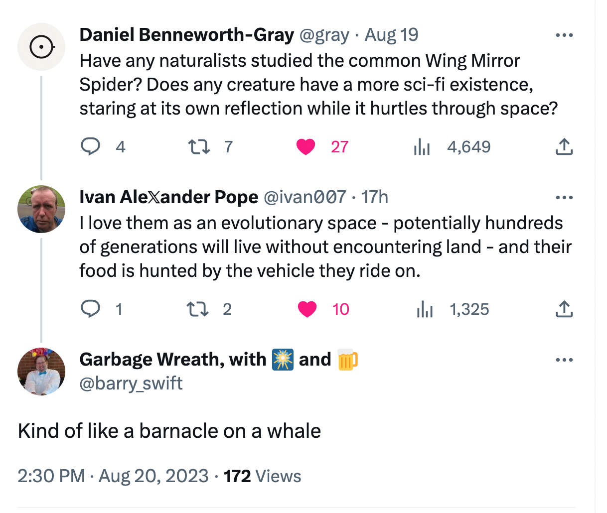God I love that so much. Not the many generations of spiders that have in fact lived in the side mirror and hood of my car for decades now mind you. Practically speaking they can get fucked but thematically? Beautiful stuff.