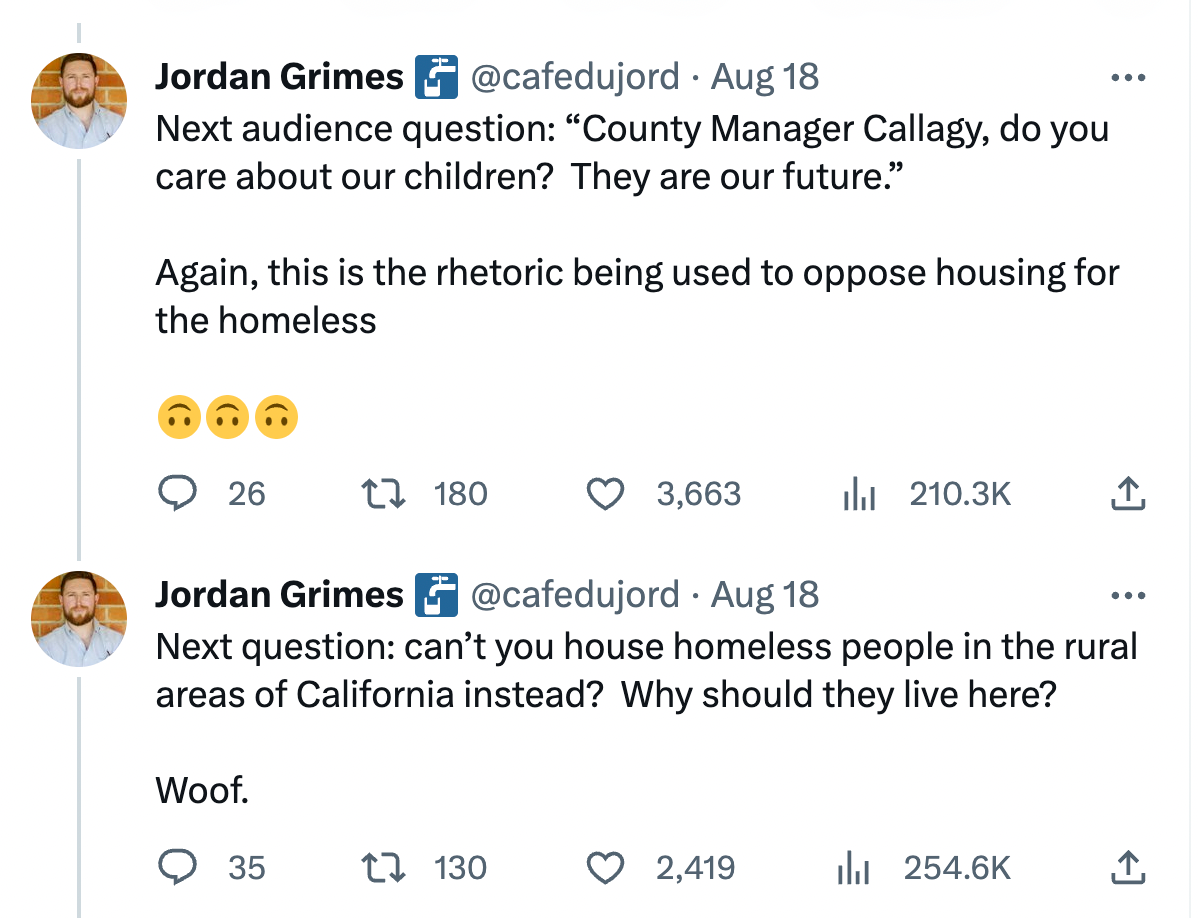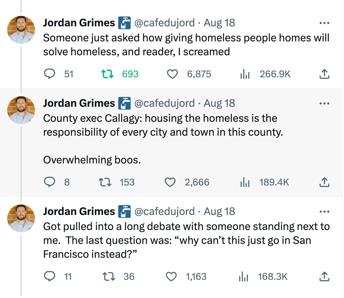You should read this thread about a city council meeting in Millbrae, California last week. Only if you want to pissed off that is. Up for discussion was a plan to turn a local hotel into housing for low income and unhoused people. Nothing terribly unique was said by the residents who oppose the plan – you can and will hear this exact same type of shit everywhere such housing is proposed – but that's kind of the point. (Here's an article from KTVU about the meeting as well).