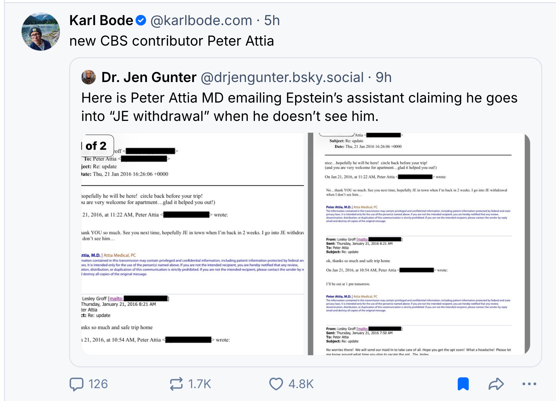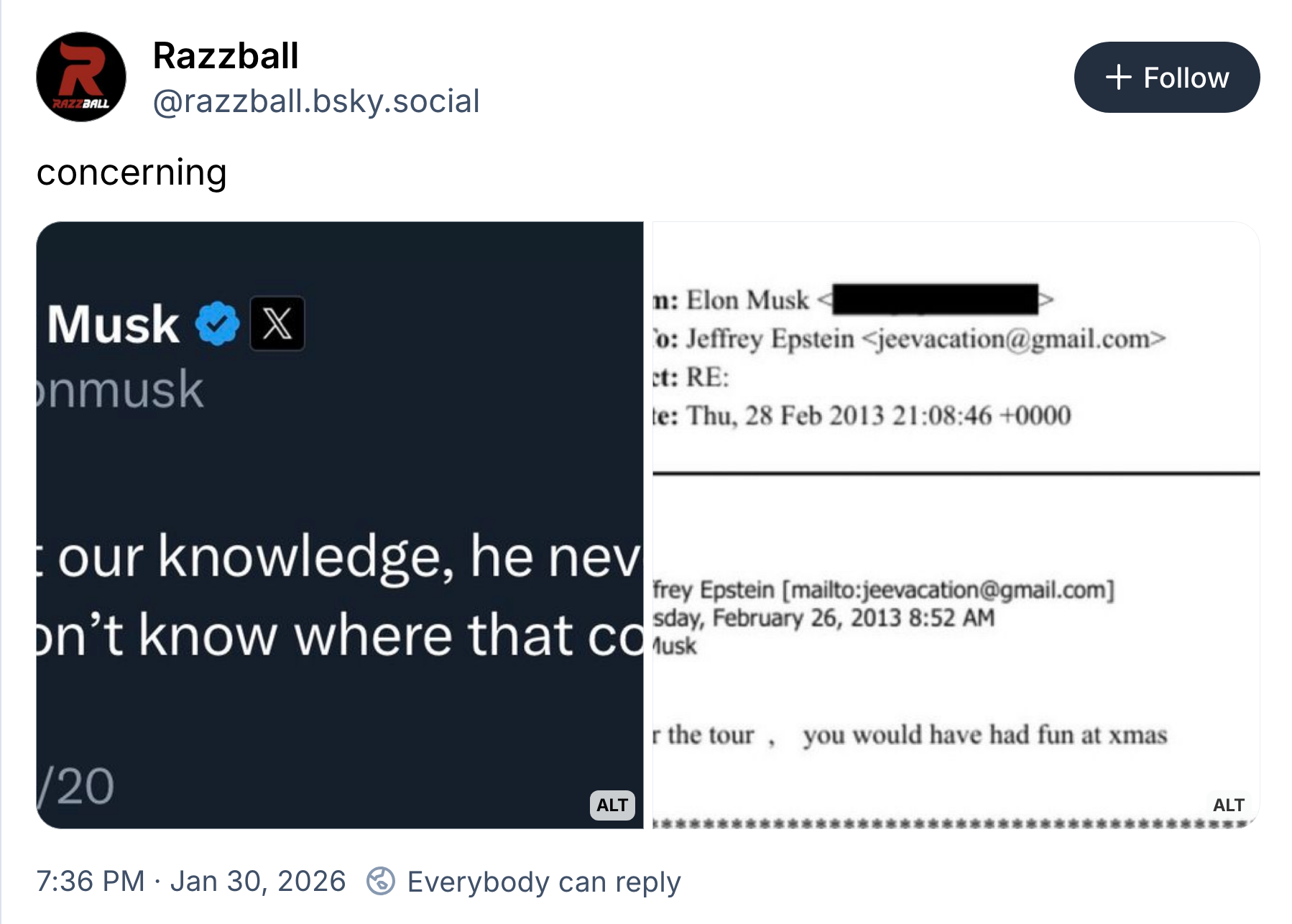 Anyone read through an onslaught of stomach-turning typo-strewn emails between a cabal of rich perverts that run the world lately? Today's newsletter is already kind of loaded so I don't have much time to get into it but I do love how every statement Elon Musk makes about Epstein has Ron Howard narrating.