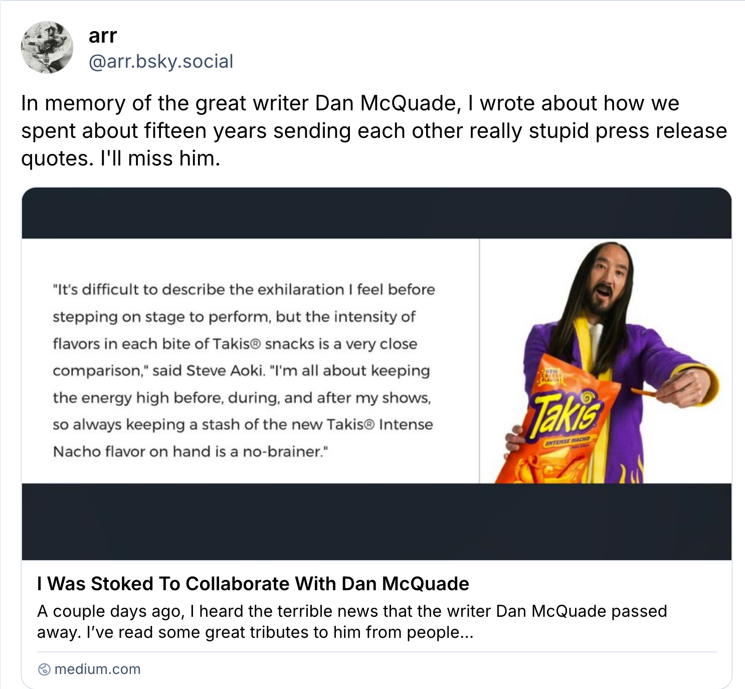 It’s hazy, but I think I first came to know Dan because he’d send me funny story tips when I was a writer at the Boston Phoenix in the early 2010s, doing a music column called the Big Hurt. One of my recurring bits was posting a roundup of music-related press releases: artists partnering with brands and generating very stilted, very fake PR quotes. (My favorite example: Pete Wentz purportedly uttering the words “I am stoked to collaborate with Nordstrom.”)
