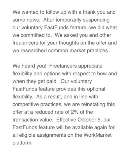 For their part, WorkMarket did indeed review the process as promised and turns out they came to the conclusion that it was good as hell after all, they just had to tweak the vig a bit. It’s now an admittedly less outrageous 2%.