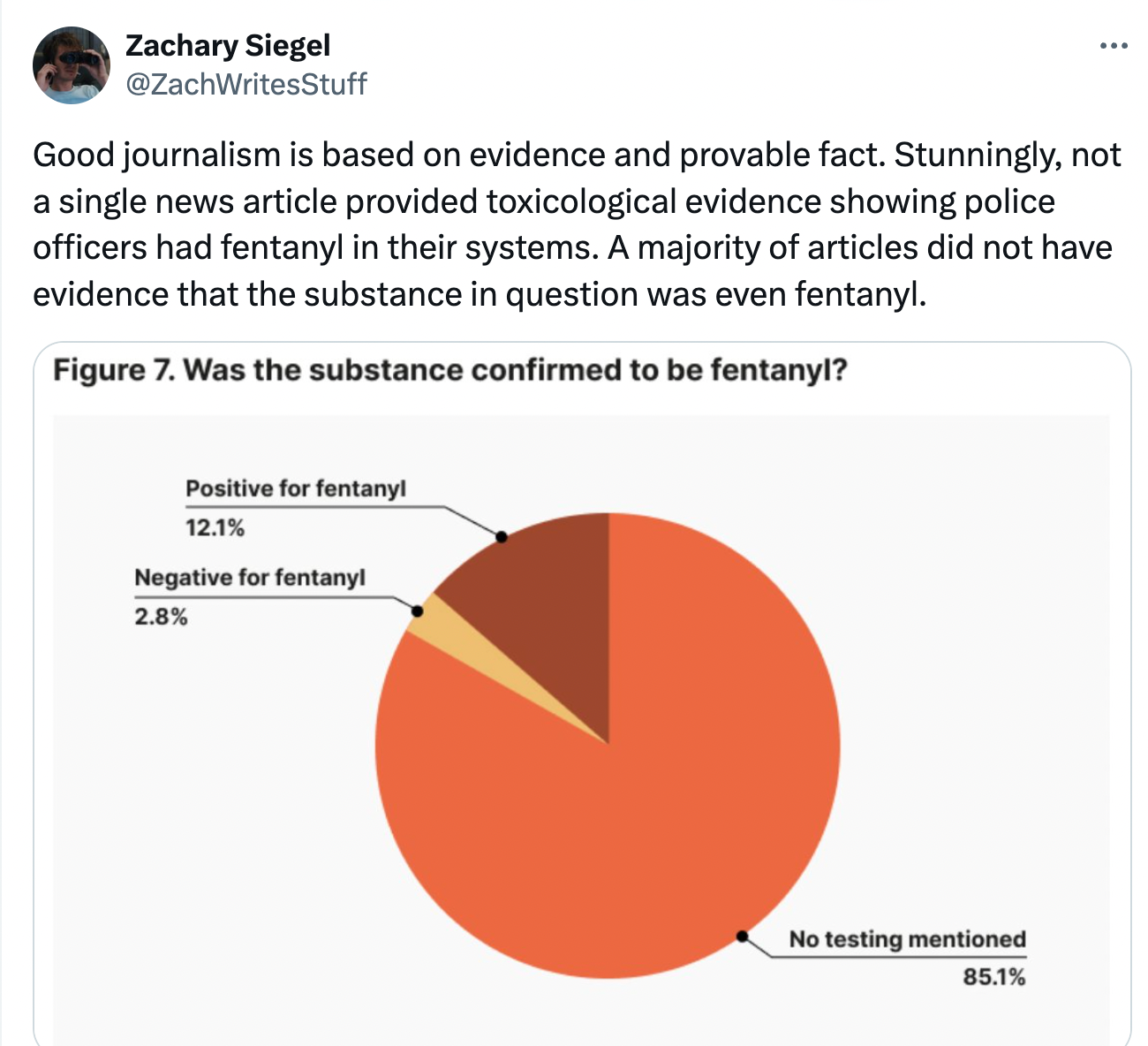Here's some very good analysis on the ways the media has covered the fentanyl exposure myth by Zach Siegel. "This report documents the breadth of misreporting on fentanyl exposure, details a breakdown of journalistic standards, highlights the public health and safety consequences of inaccurate reporting, showcases examples of coverage that get the story right, and offers tips for reporting on similar issues," he writes.