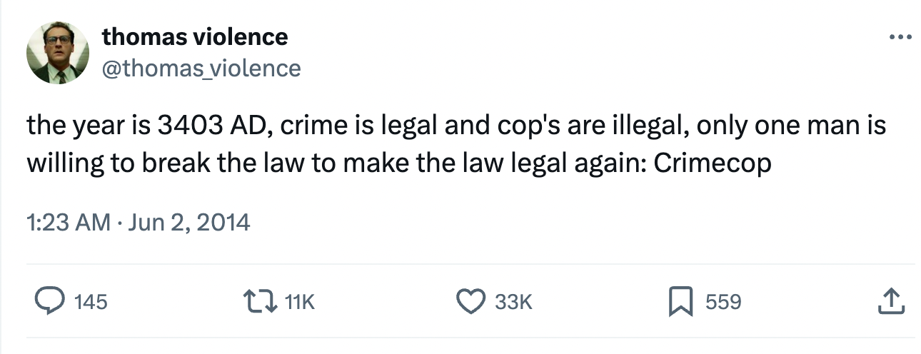 I don't think I really feel anything about the Trump verdict yet. I can’t squeeze a drop of dopamine out of it. I suppose it's funny that Mr. I Love to Do Crimes and Never Face Any Consequences finally faced a consequence. I guess there is that. And I guess it's funny that every Trump supporter is talking like this now: