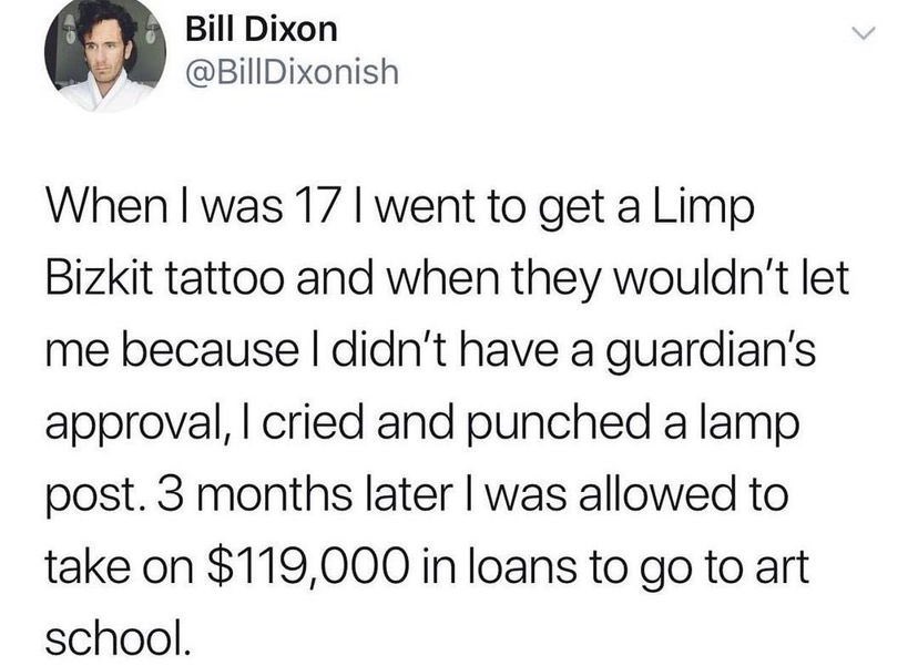 Back to the sleight of hand though. So these kids they come out of college and go to get a job and – whoops! – start getting paid shit or can't find a job in their field and so all the while their debt balloons. Then when they have the temerity to complain about what a raw deal they got with these unpayable loans skyrocketing every day the responsible and sober and money-knowing adults – the very same ones who said go to college or else – will berate them for having made a dumb investment choice with the loan they got pressured into. And this is the real clever fuck you part: those same wise adults will also try to convince the college graduates that they are actually the powerful ones here due to the cultural vibes of their degrees. Doesn't matter if they're broke and underwater. They paint college-goers as some kind of elite class simply because of the hypothetical money-earning power of the degree rather than the actual material circumstances they find themselves in. Let them pay off their student loans with their blue check on Twitter.