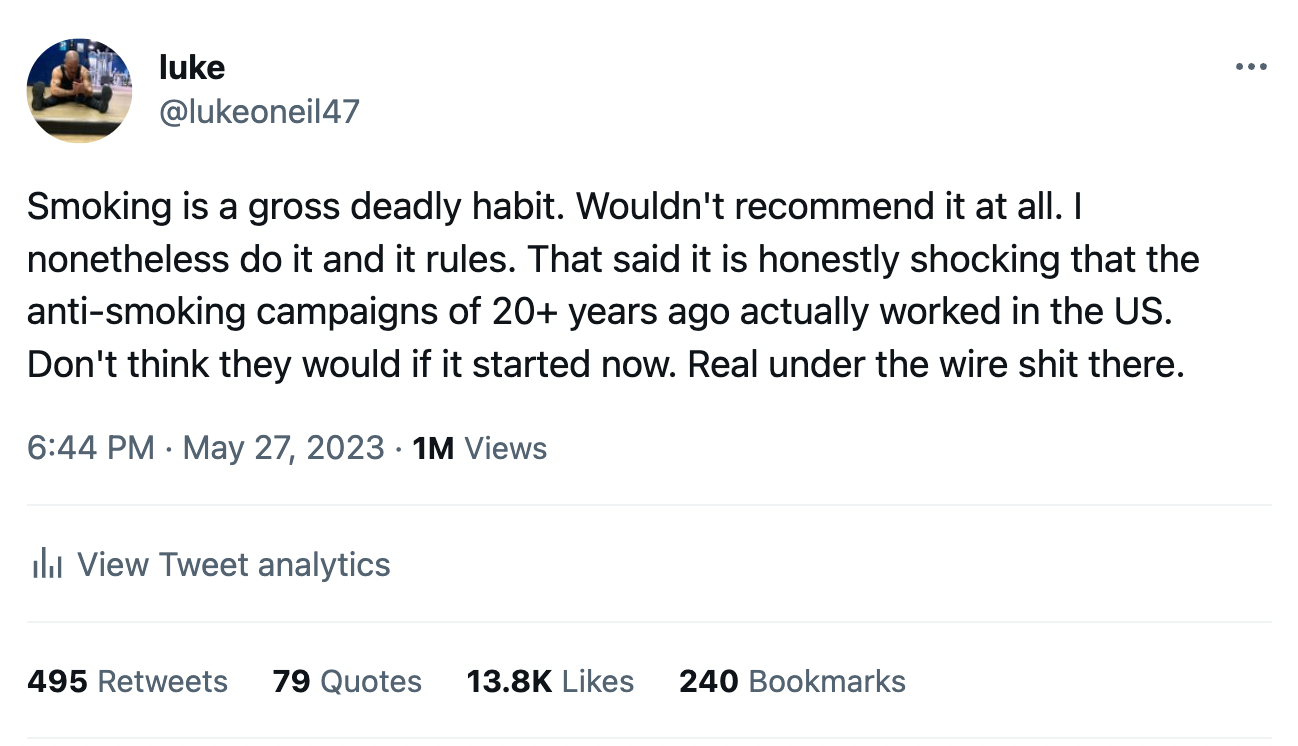 There has been a lot of talk about smoking going on on Twitter lately for some reason. Who can say why people talk about anything. Here's some of what I think on the matter.