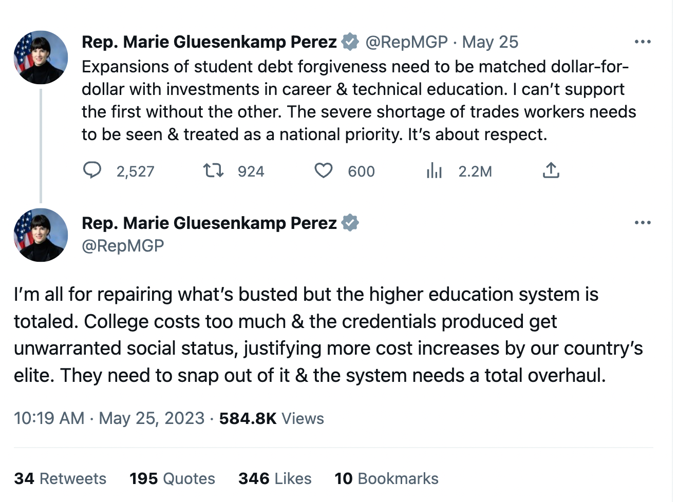 She’s doing the rote reactionary lie about student debt. Meanwhile significant percentages of people didn’t graduate and still have the debt or else went to a trade school or community college and still have the debt. Elsewhere the people who do in fact have the fancy degree that makes it ok for them to suffer have paid the cost of the loan off 2-3 times over by now.