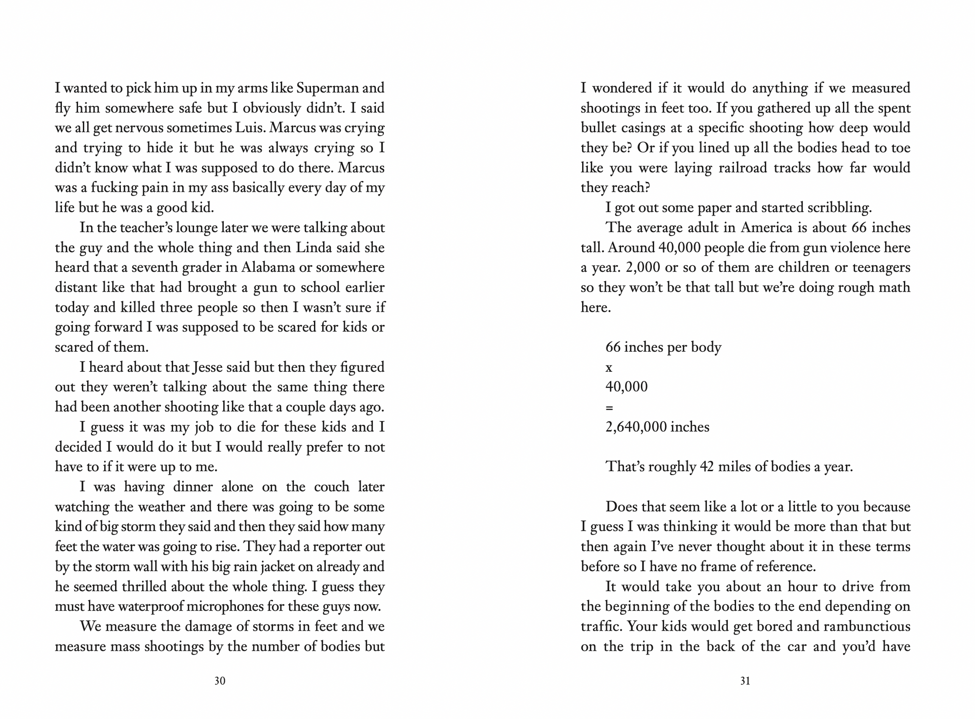 I can’t remember what I said, but I know I didn’t tell them that a gunman had murdered kids their age that afternoon. That the police stood by with their big guns and all their power and did little to stop it, because in America it’s about having power over the powerless, and that sometimes means letting some children die in yet another massacre. One that could have been avoided if we didn’t fetishize guns and gun culture.