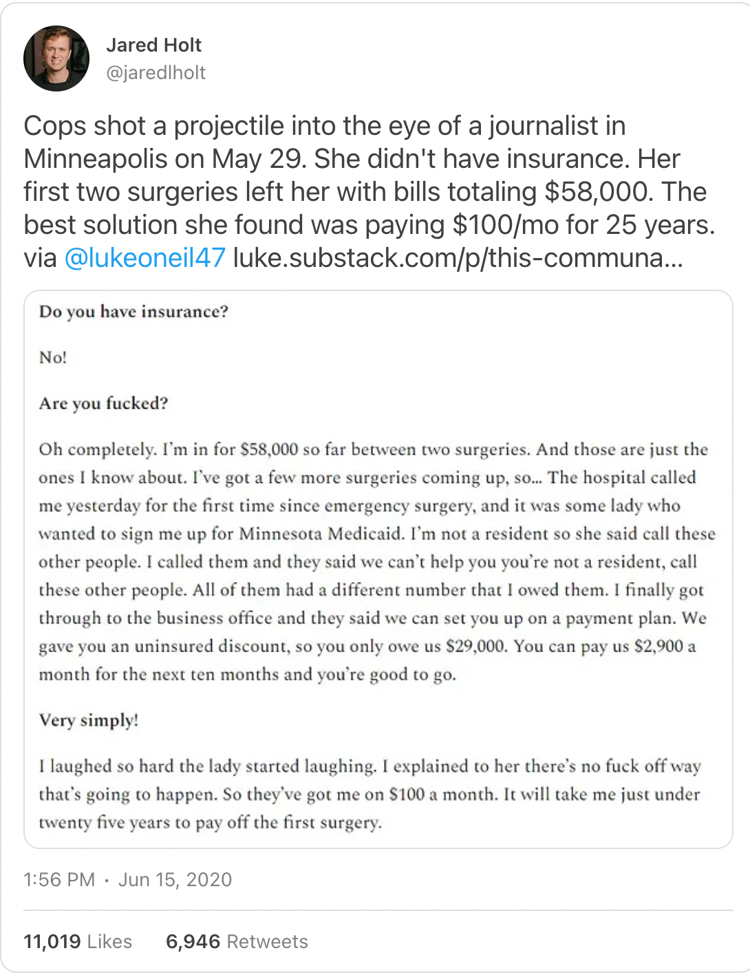 As to the realisation for how fucked the US was; there was no one revelation moment, but when I first heard that people didn't want to call ambulances even when they were having medical crises because of bankruptcy, that was a moment. When I learned that insurance companies were actually advising people to do crowdfunding to pay for life saving surgeries, that was a moment. When I saw the guy in the midst of a deadly pandemic getting charged [a lot of money] for doing the right thing and getting tested, that was a moment. When I told my family about the journalist [who got her eye shot out by police] even though we all know about the US healthcare system, they still didn't quite believe such a thing could happen. “Surely they're insured?” That was a moment.