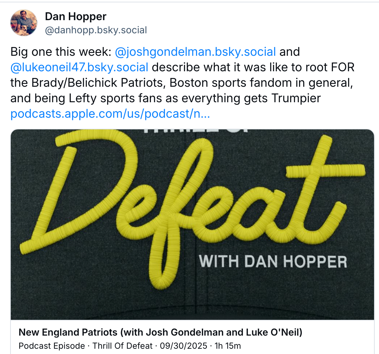 Everything fucking sucks but the Red Sox beat the Yankees last night and the Patriots won over the weekend and if reading that sentence doesn't piss you off you might enjoy listening to me and Josh Gondelman talk about being the only good Boston sports fans in the world on the Thrill of Defeat podcast. It's a real fun one for anyone to be honest. We had a lot of laughs.