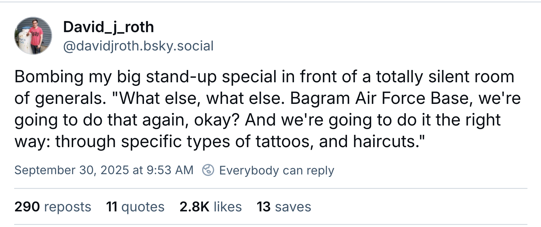 “Lethality is our calling card,” said Hegseth, “and victory our only acceptable end state.” Big talk for the leader of a military that hasn’t won a war in 80 years. After forty-five solid minutes dropping blood-and-guts Reichsparteitag applause lines into a dead silence, the visibly dehydrated Hegseth was left licking his lips desperately between each word, the only recourse for a man who believes that drinking water is for queers. After explaining that he plans to fire every woman and minority in the U.S. military as well as any “fat generals” he might find, Hegseth rallied the rest of the troops by recommending that if they don’t like doing war crimes they should quit. He closed his remarks to a universal lack of acclaim followed by the most polite smattering of applause imaginable, then walked confidently offstage to beat a wife.