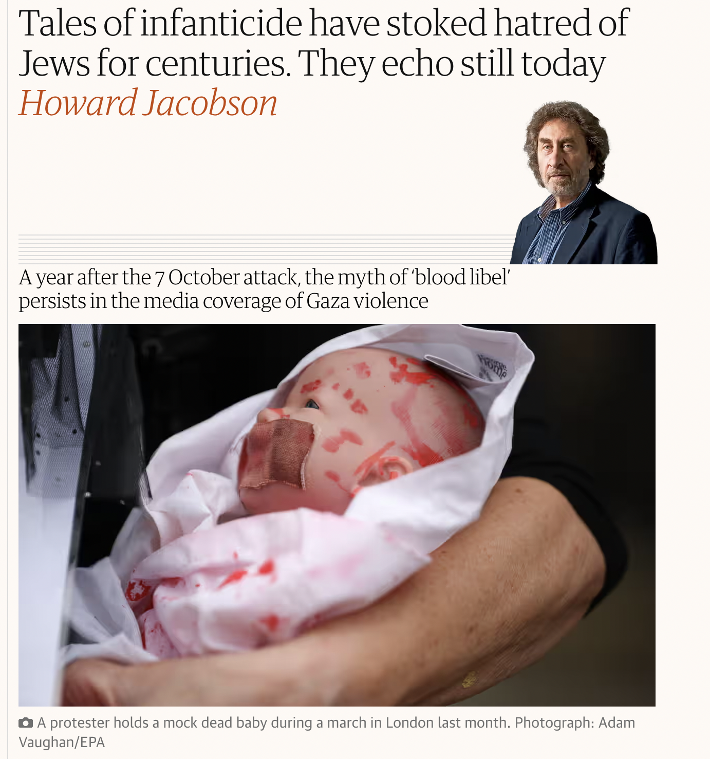 I wanted to include a screenshot here because it's important to see the art they used. A fake dead baby. An appropriate choice for the argument the piece is trying to make. To the extent that there is any point to the piece besides genocide denial coupled with justification for the genocide it is denying. A very common way of thinking I've seen over the past year. This is not happening like they say it is but if it is they have it coming.