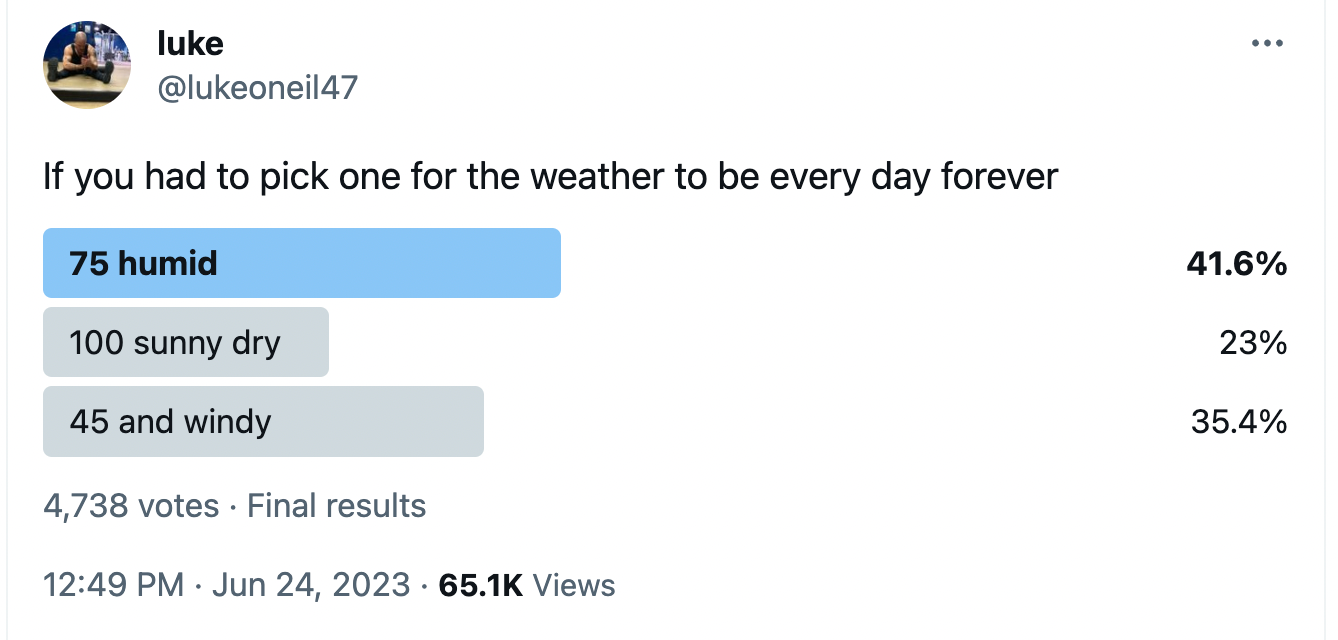 Speaking of the humidity look at the state of this poll I ran the other day. These perverts. These sick fucks. 75 and humid is as bad as it gets. Give me the cold biting wind any day over this. At least a jacket and a hat is a respite.