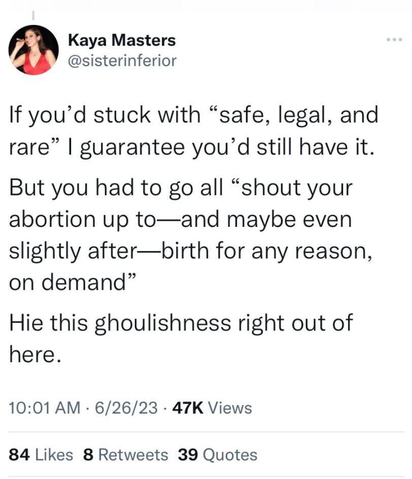 The right are doing the same thing when it comes to abortion as well. We were so reasonable. We very generously indulged your rights. And now you have forced us to take them away.