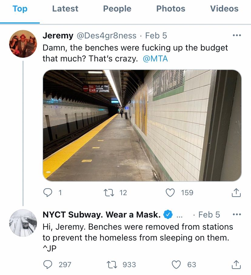 “The unfathomably evil part of the NYC Subway thing is it's not like the benches were there to help the homeless. They aren't ‘merely’ trying to keep the station clear of the homeless, they're actively taking away things that benefit everyone just because the homeless also benefit.”