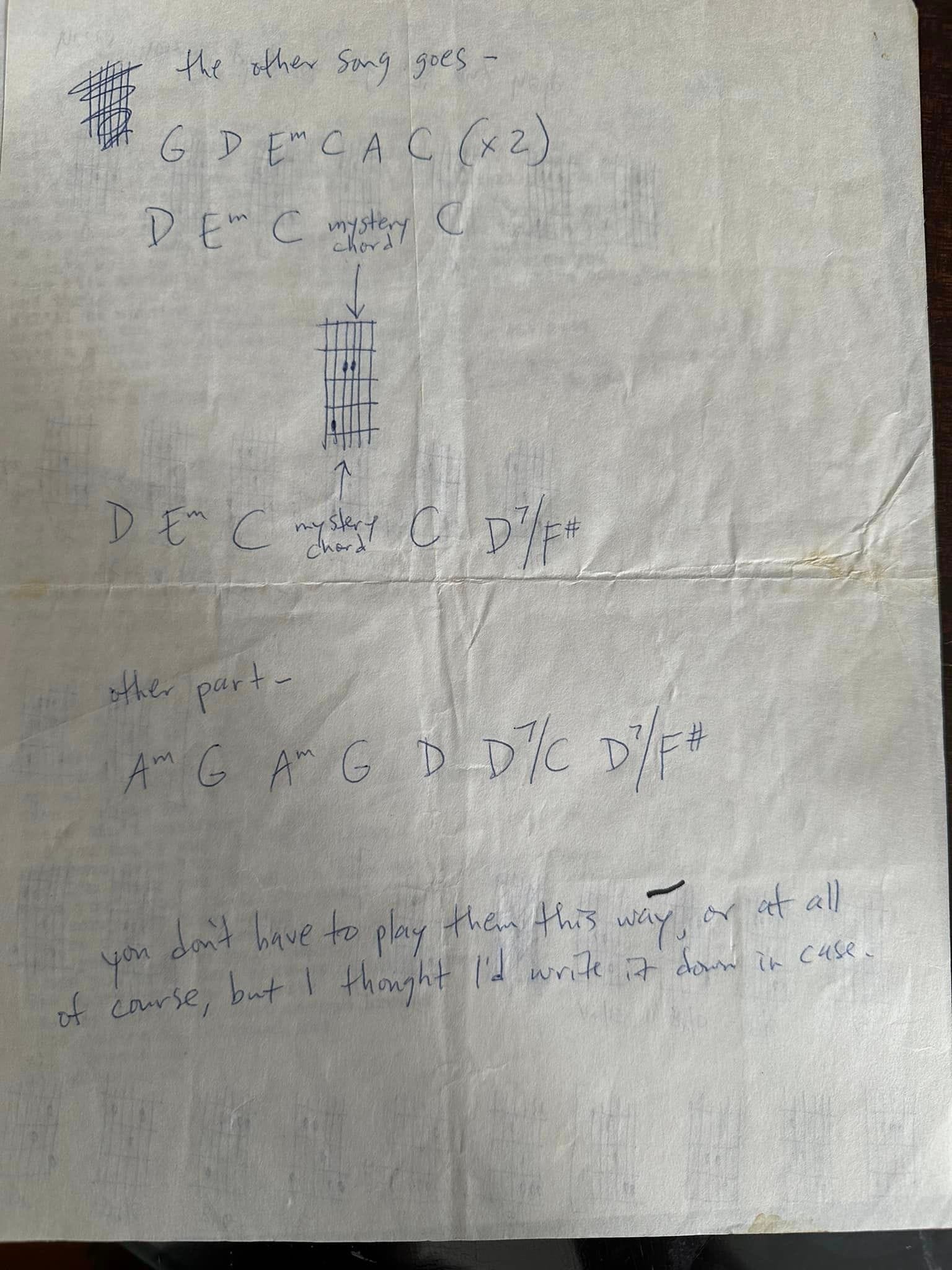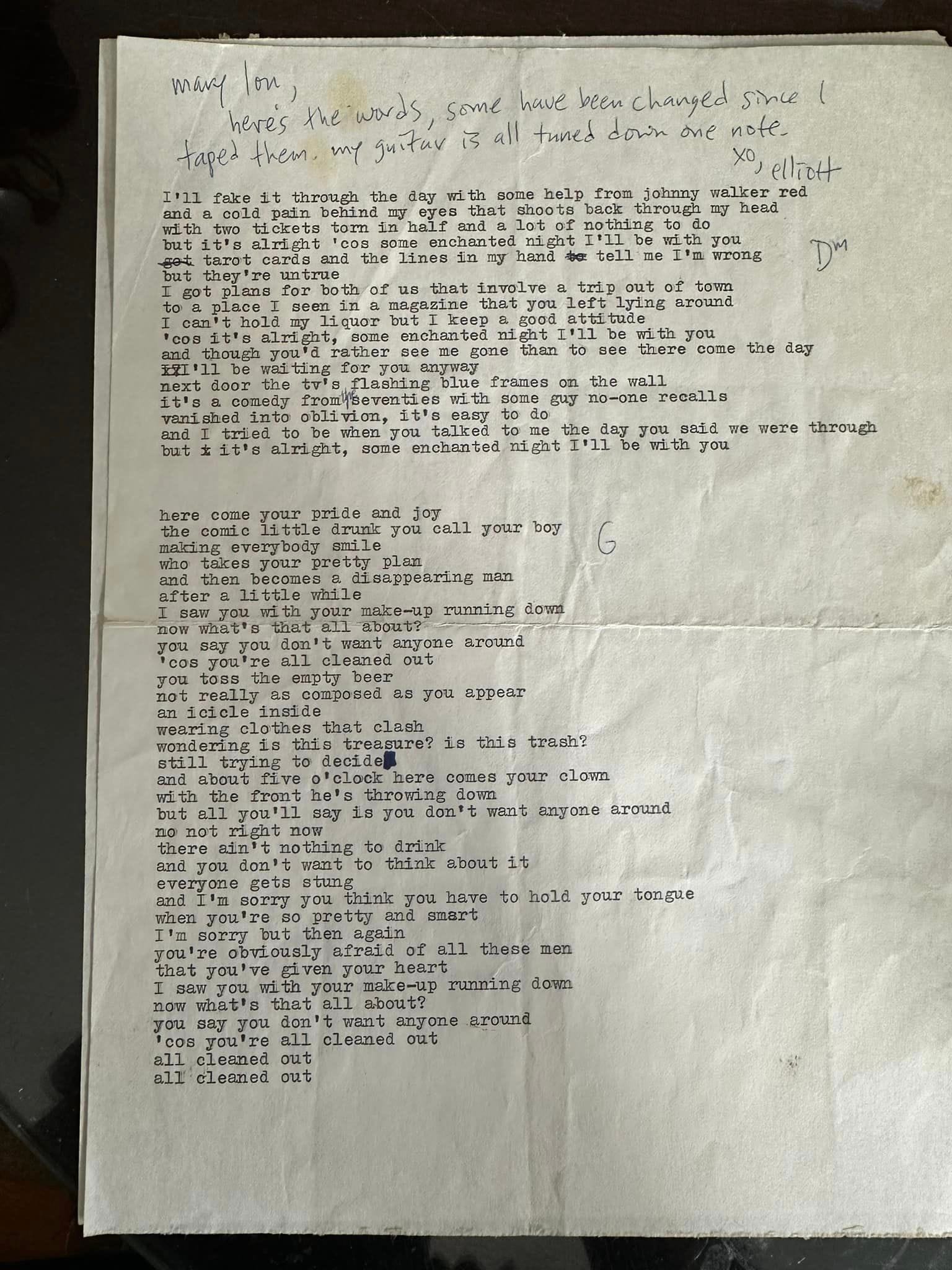 "When I first dated my ex wife Mary Lou Lord she had a buddy that used to sleep on the couch when they were touring together. Great guy that I had a lot of fun times with… anyhoo he used to give her songs he wasn’t sure about. I remember her getting these lyrics with a cassette tape. He wasn’t sure if the song was any good, told her she should maybe take it. Today these were found inside a book at my house. Original typewritten lyrics (on a typewriter) with handwritten notes. Elliott Smiths original lyrics to Miss Misery that ended up getting him nominated for an Oscar. Miss my old drinking buddy Elliott…"