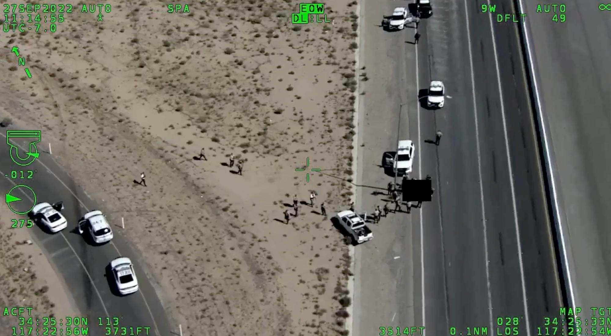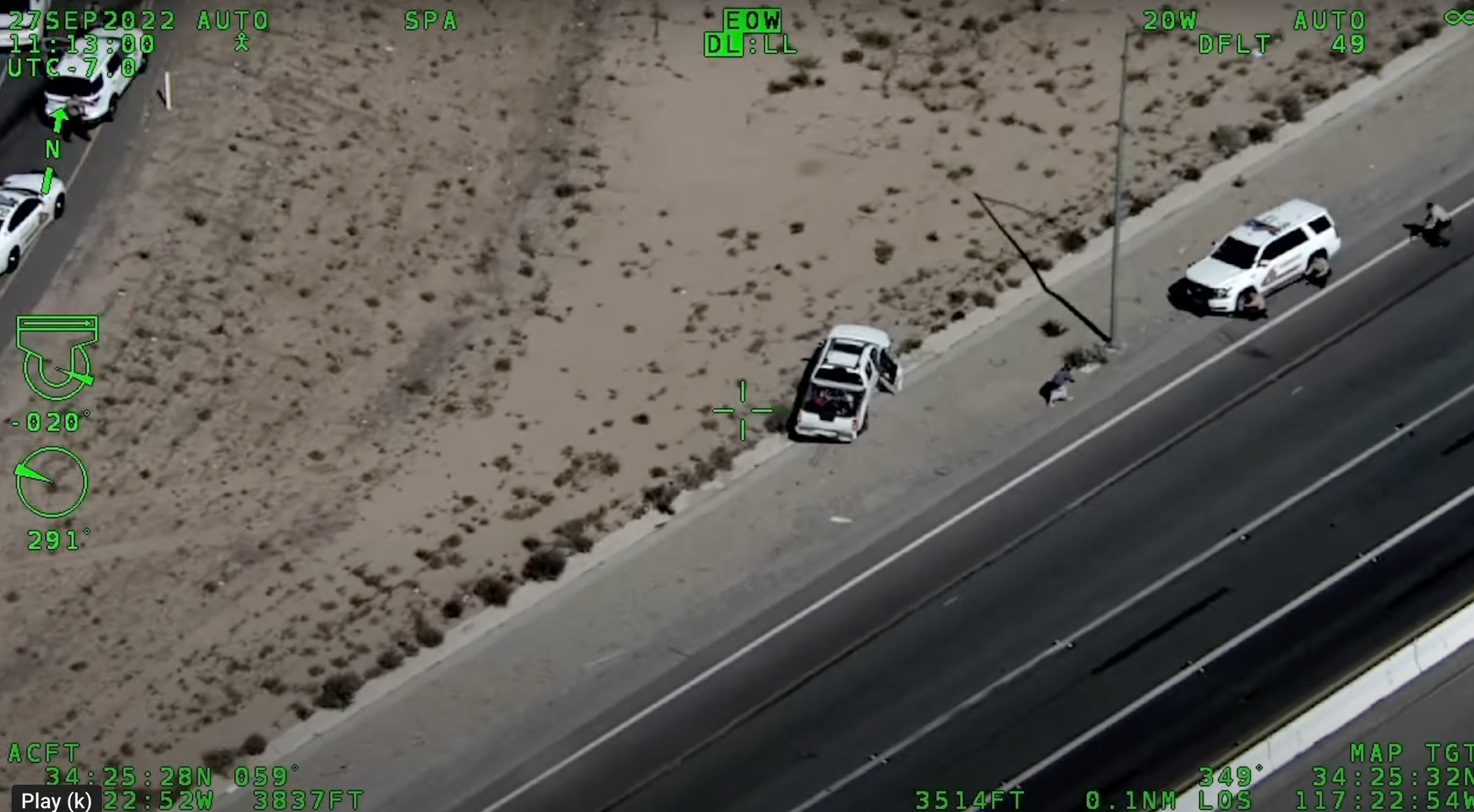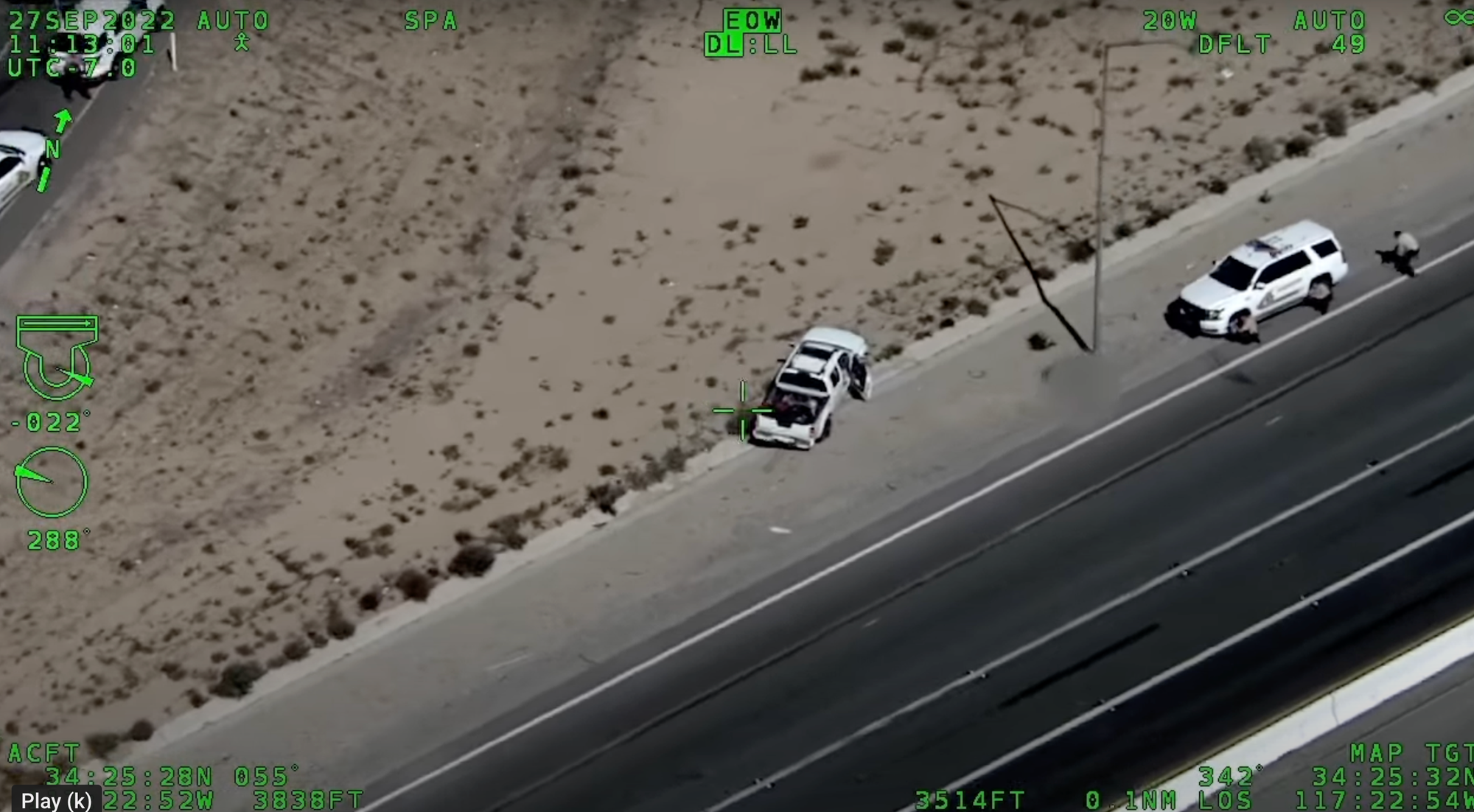 When police eventually caught up to them, he took deputies on a 70-mile pursuit on I-15, shooting back at them on the busy freeway. In an attempt to turn around by going the wrong way on an off-ramp, he drove up an embankment and stalled. In the video footage, his truck can be seen rolling backwards towards deputies, with dirt being kicked up from police gunfire missing the truck and hitting the ground all around it.