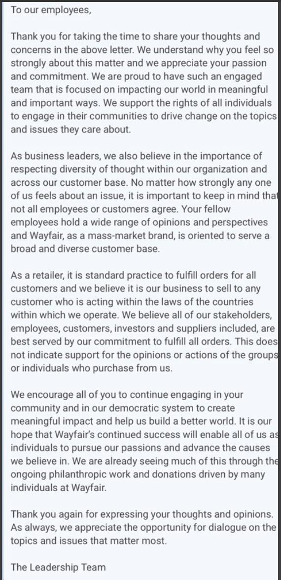 “We know what we believe in,” he said to applause. “We want to do what’s right. At Wayfair, we have a great team, and we talk internally about how we hire the best people. We’re looking for the best and the brightest, and those just so happen to be the people that care the most, people we know will fight for what’s right even if it’s a difficult conversation right now...”