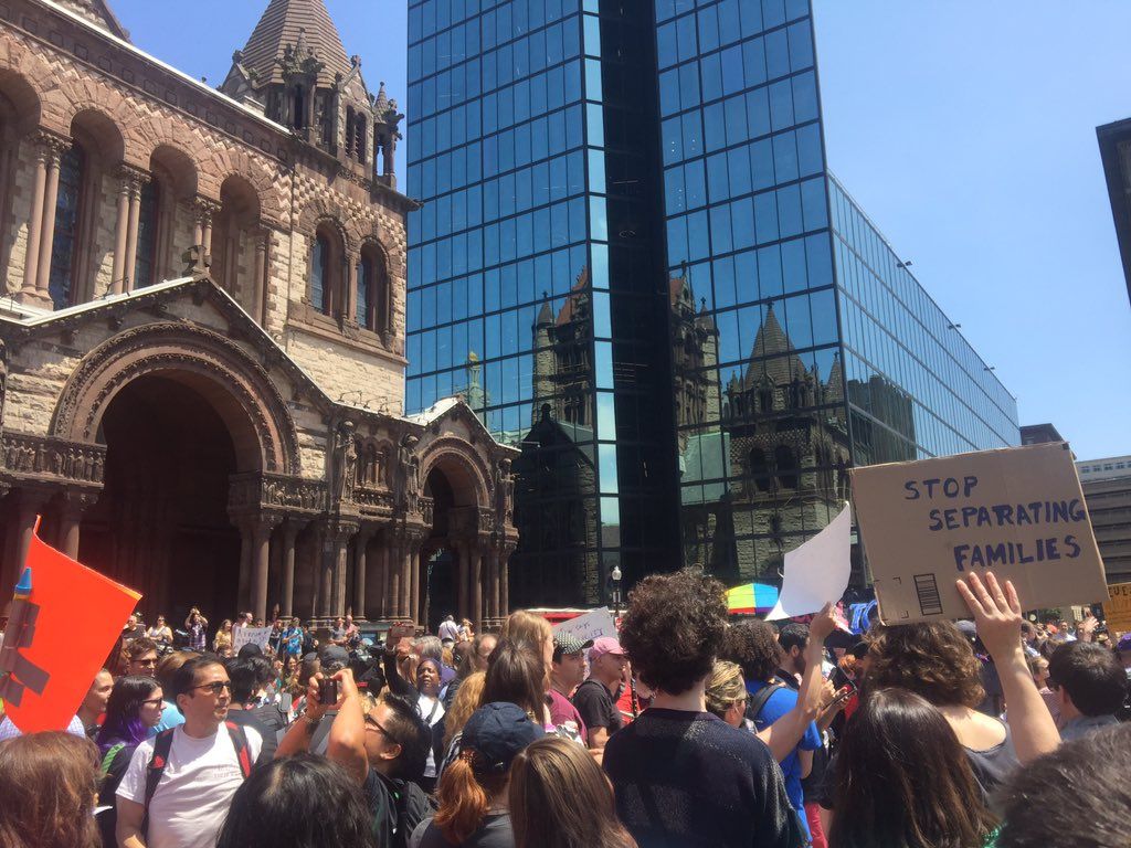 That feeling was also due to the large crowd of people who were listening to the representative of the Boston Independent Drivers Guild speak. He was there with a number of other labor groups protesting in solidarity at a walkout organized by workers at the Boston-based e-commerce giant Wayfair. Around two thousand of us had gathered on Wednesday afternoon in Copley Square at the foot of Trinity Church with the glaring sun bouncing off the Hancock Tower because we were fed up with companies in general and Wayfair in particular profiting off of the torture of migrants which is what is known as the baseline level of decency you can have at this point in our country-wide slide into the abyss.