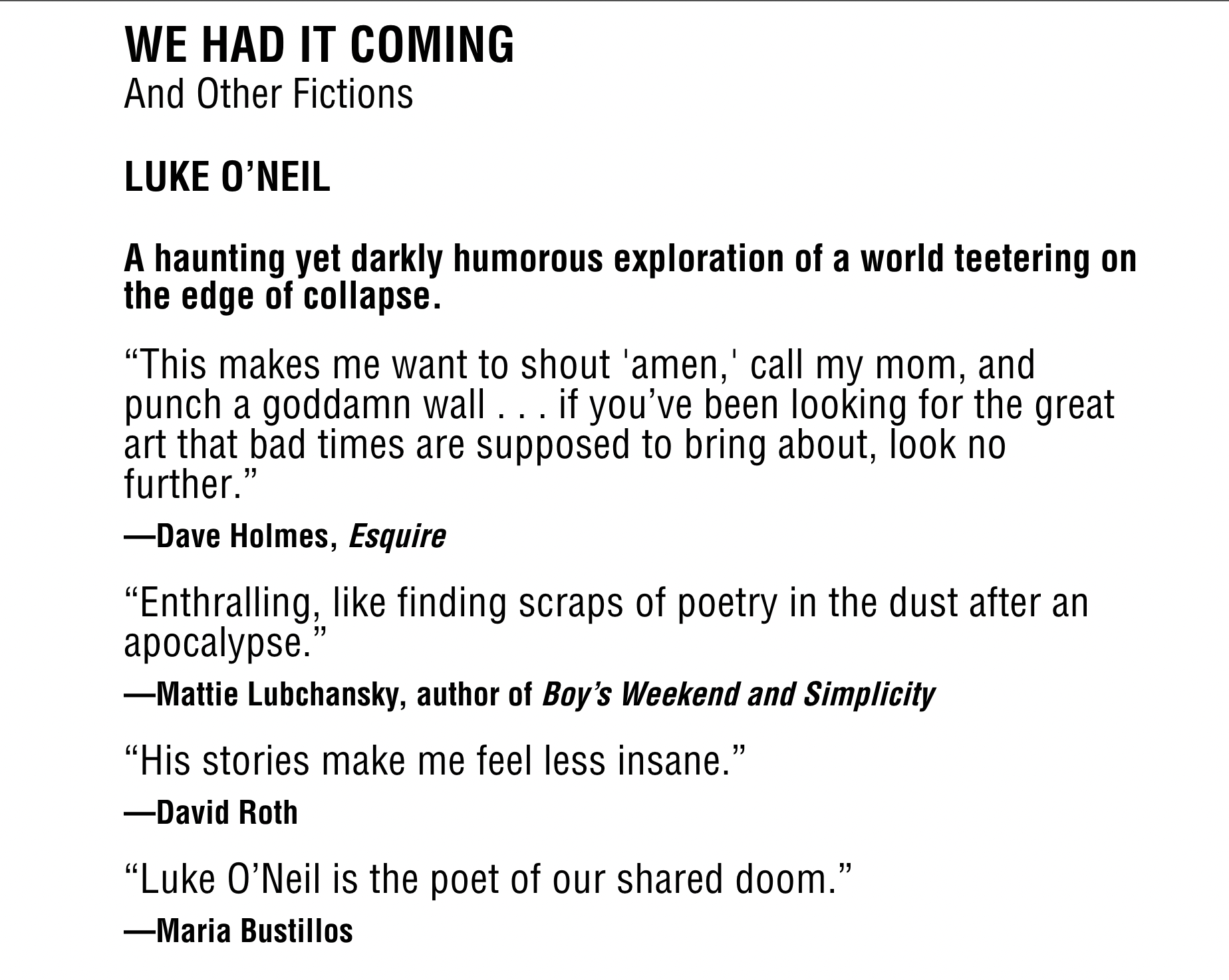 Luke O’Neil is the poet of our shared doom. We Had It Coming offers stories brimming with pitch-black gallows humor, indie rock criticism, rhapsodic epiphanies and stark terror, hopes false and true, and tender insights laced with dread. It’s good to know that at least we’re all in this Hell World together.