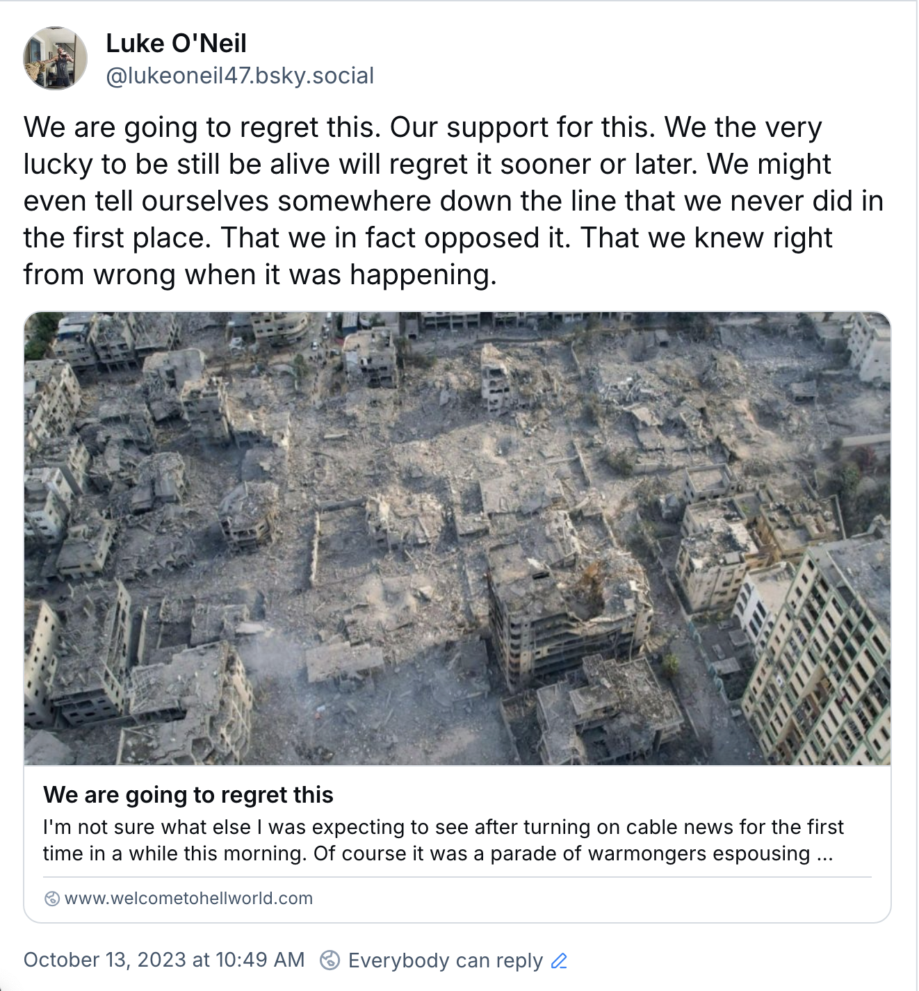 I am telling you we are going to regret this. Our support for this. We the very lucky to still be alive will regret it whether that is sooner or later. We might even tell ourselves somewhere down the line that we never did in the first place. That we in fact opposed it. That we knew right from wrong when it was happening.