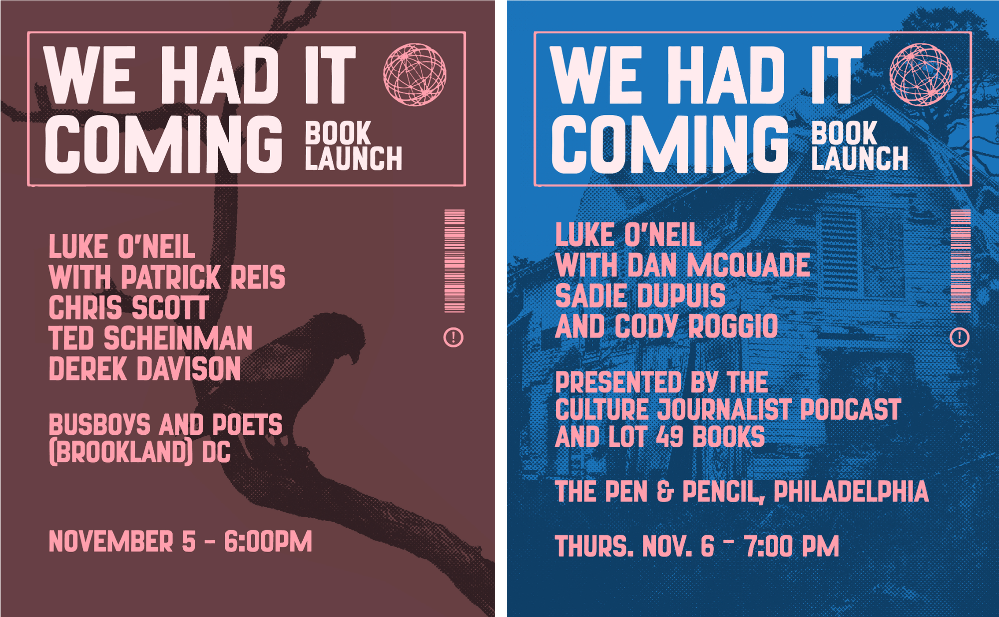 I'll be reading and talking about We Had It Coming with a great group of friends and colleagues on the following dates: