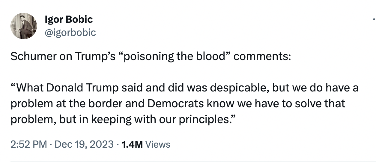 Then after I went to all that pointless posting effort Chuck Schumer came right out and made my entire case for me. When asked about Trump's recent comments that immigrants are "poisoning the blood" of America – something even a number of Republicans (lying) felt the need to go "come on man" about – Schumer had this to say:
