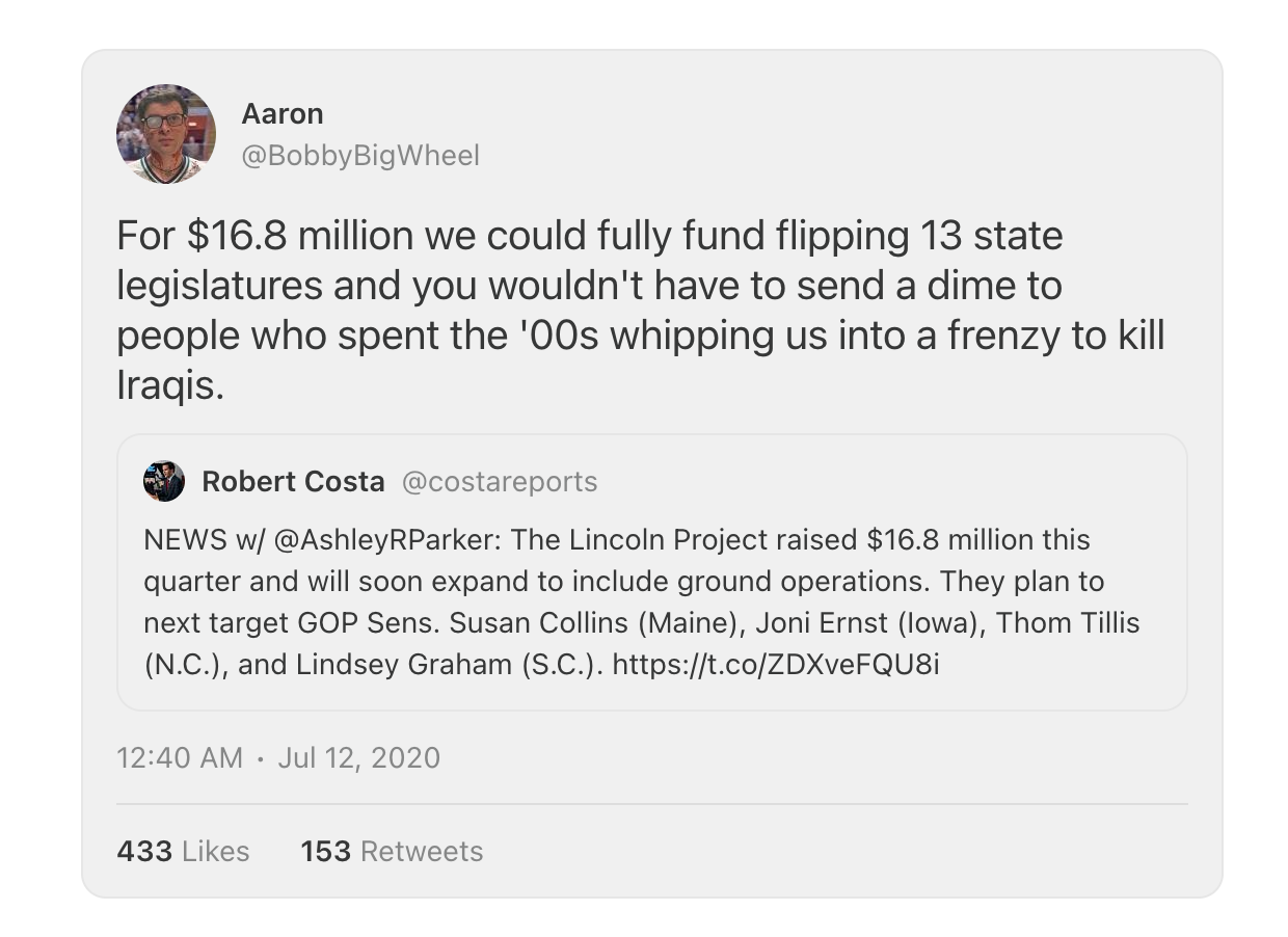 That kind of memory hole is a nightmare situation for historians, journalists, and anyone who hasn't given up yet. But it's perfect for the personal fortunes and future career opportunities of the Lincoln Project, and that’s the whole point.