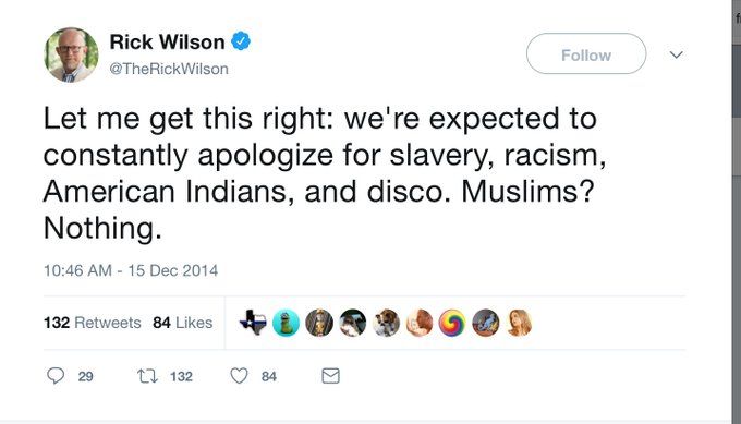 But before his career reinvention as a "principled Republican," Wilson was known for his unfiltered bigotry on Twitter, unapologetically throwing transphobic slurs at his enemies in attempts to emasculate them, slinging racist insults at Trayvon Martin, xenophobic just-this-side-of-genocide prescriptions for the U.S. military in its dealings with Muslims, and other equally repulsive illiberal racist and bigoted views including now deleted Instagram posts showing prominently displayed Confederate paraphernalia on his boat.