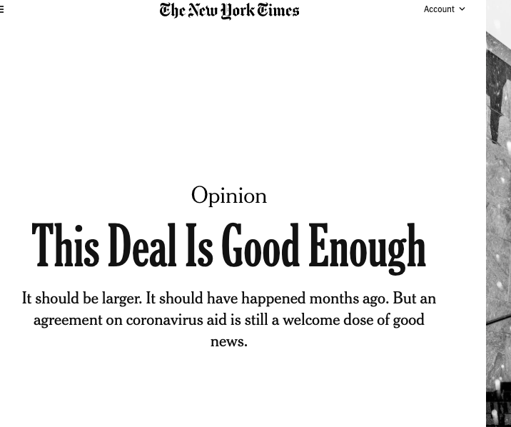 I keep trying to read about what’s actually in the relief package and then I see some section about business lunch expenses or whatever and a protective shield deploys over my brain like an armadillo rolling into a ball and I close the article. Guess I’ll never know.