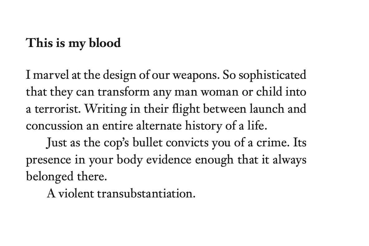 A lot of people are wedded to this idea that it’s somehow so much worse to be brutalized or killed by a man standing there in front of you than by a pressed button or pulled lever. Or to be systematically killed by laws and policies of indifference or outright malevolence.