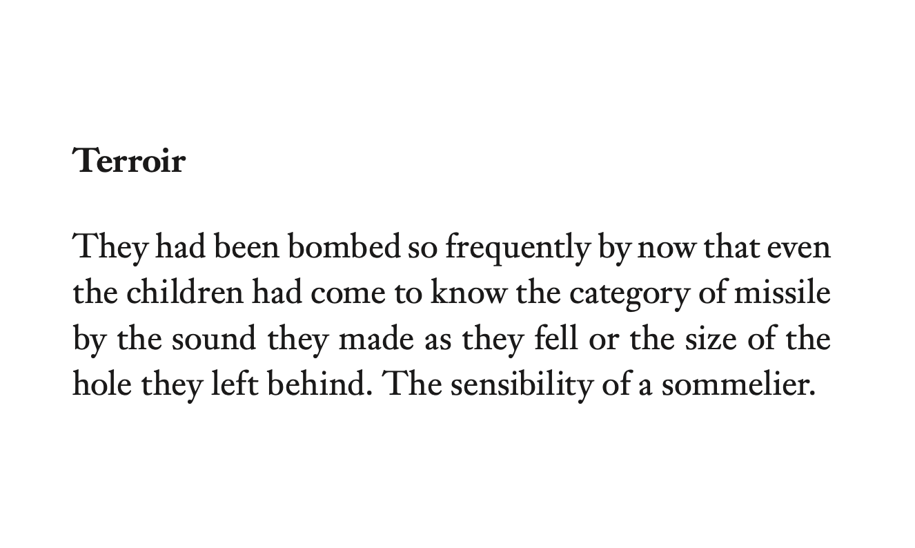 I also think that it is very convenient that the dominant power in any given conflict almost always gets to commit their own war crimes from a remove via blockade and sanction or missile and bomb. Each resulting individual civilian death observed from an abstract sanitized distance in the form of a building collapsing. Being made to collapse.