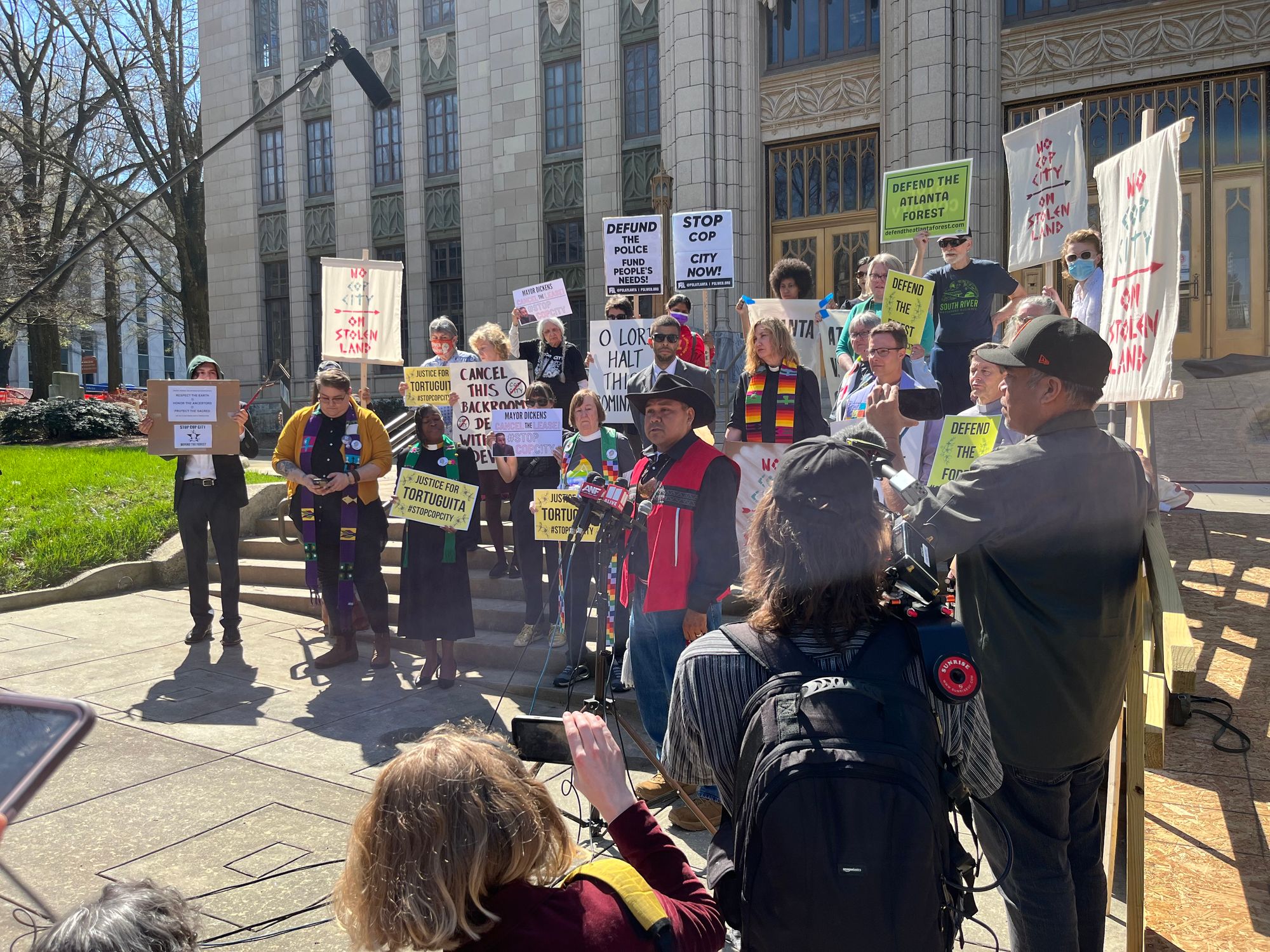 Despite the extreme repression, the Week of Action was also a reminder of the strength and diversity of the movement. On March 6, clergy hosted a press conference outside of Atlanta City Hall in which they issued a moral and spiritual call to not just halt the Cop City project, but also to engage with the Black community surrounding the forest land and the Muscogee people from whom the land was originally stolen to create a new vision for the space. Throughout the week, activists targeted various corporate funders of the Atlanta Police Foundation with nonviolent direct actions, urging them to drop their support for the project. A rally on March 9 hosted by Black-led organizations including Community Movement Builders (CMB), the Movement for Black Lives, Black Voters Matter, and others, demanded an end to Cop City, and dispelled the city’s attempts to characterize the movement as a white one.