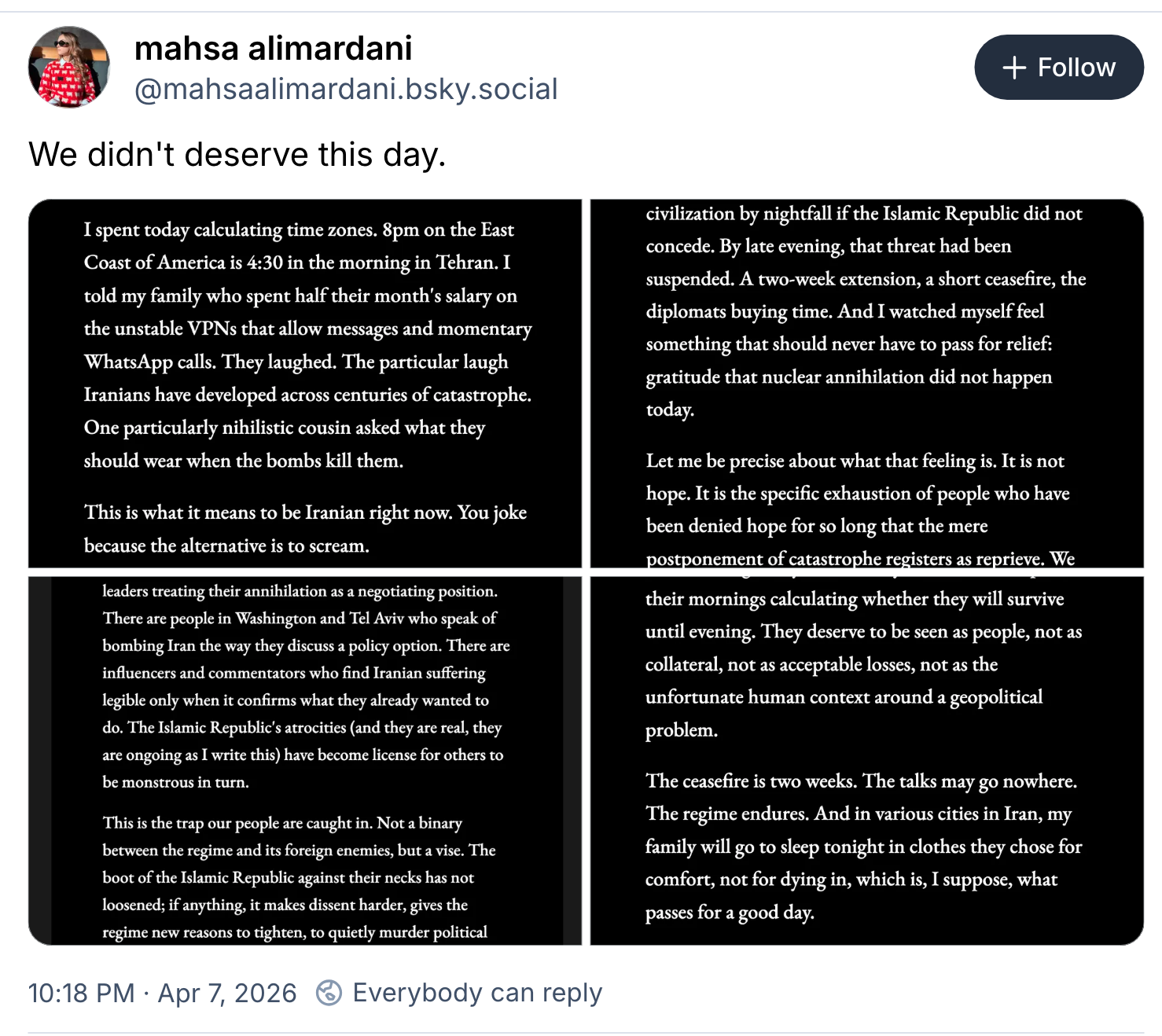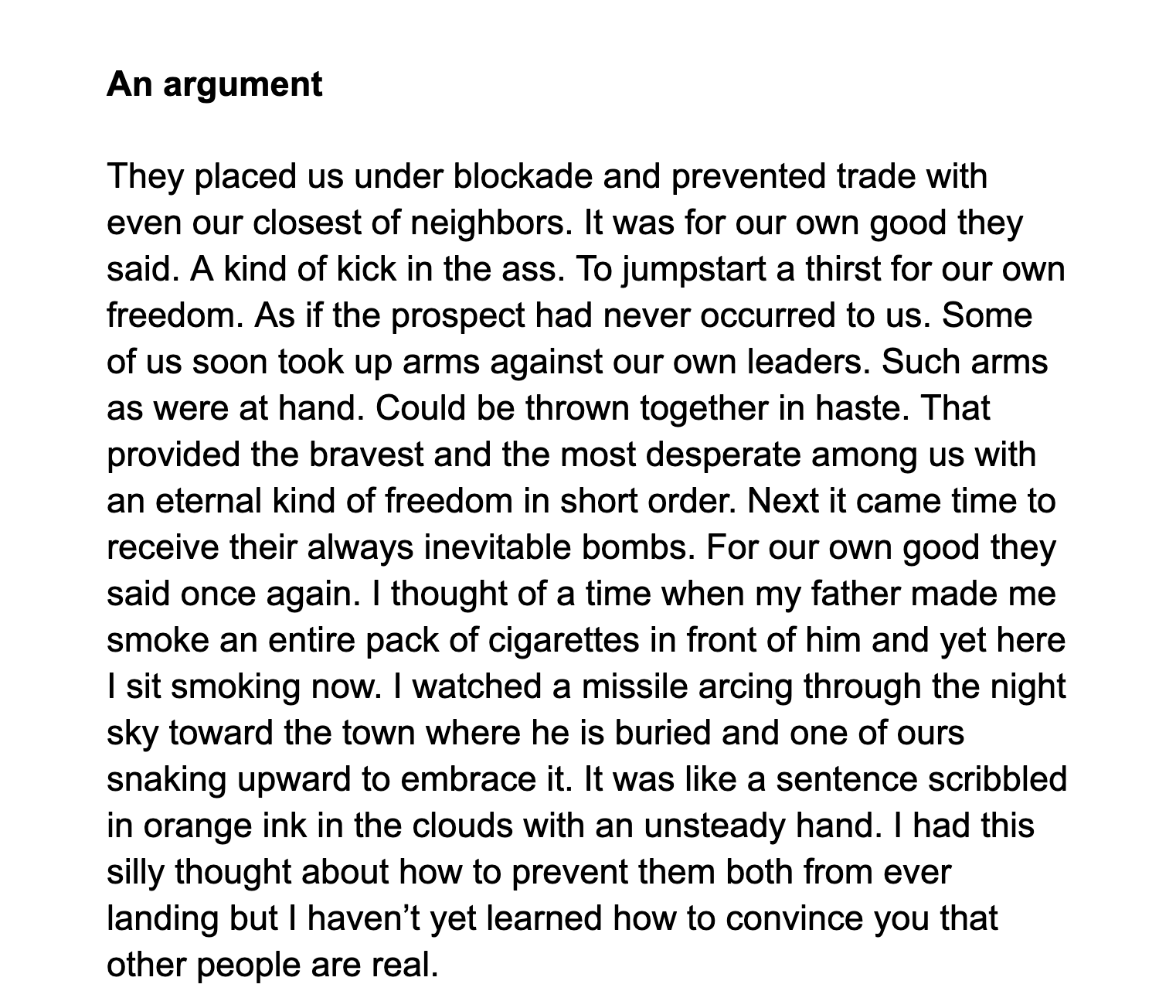 The AI sickness and the expanding wars do not represent, as their overlapping marketers promise, the end of history. These stunningly idiotic, VC-funded nightmares represent the arrival of a new era in which the only sure bet is unpredictability. In this new world the most important skills to retain are the ability to love, to care, and to never stop moving – even when all you can see is smoke, and when all you can hear is a faint but persistent pulse.