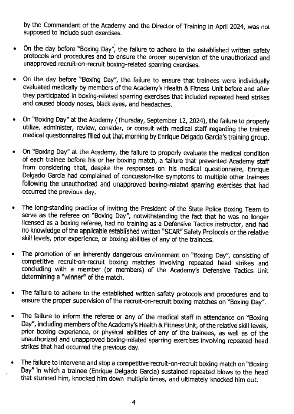The day before the match that killed Delgado Garcia, there was a round of “unofficial” boxing matches. What that term entails remains murky. "Neither the members of the Defensive Tactics Unit nor the Academy command staff were able to provide a clear picture – whether verbally to investigators or to the Special Statewide Grand Jury, or in writing in the daily Academy activity reports of who had been present and what had occurred during the boxing-related sparring exercises on Wednesday.” It was Wednesday, September 11, 2024. Delgado Garcia sustained concussion-like symptoms during that unofficial boxing match.