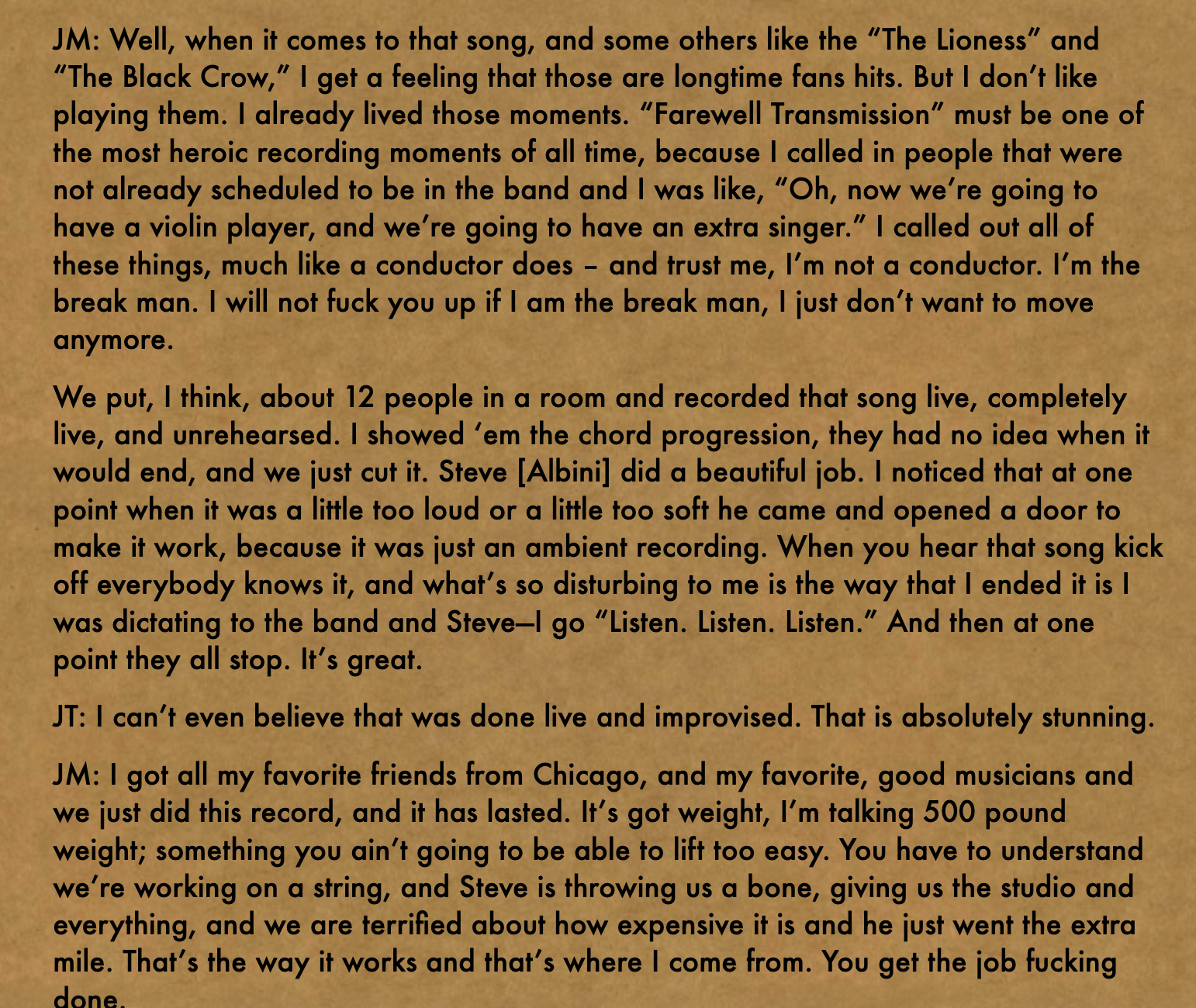 Did you know this next thing because I did not. That Farewell Transmission was recorded basically in one take with the band playing on the fly following Molina's lead? And that the ending lines the haunting terrible warning of "listen....listen" was actually Molina instructing the band to pay attention so they'd know where to end it?