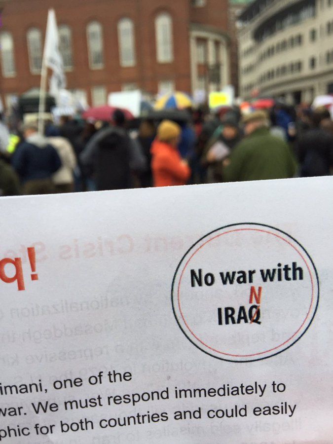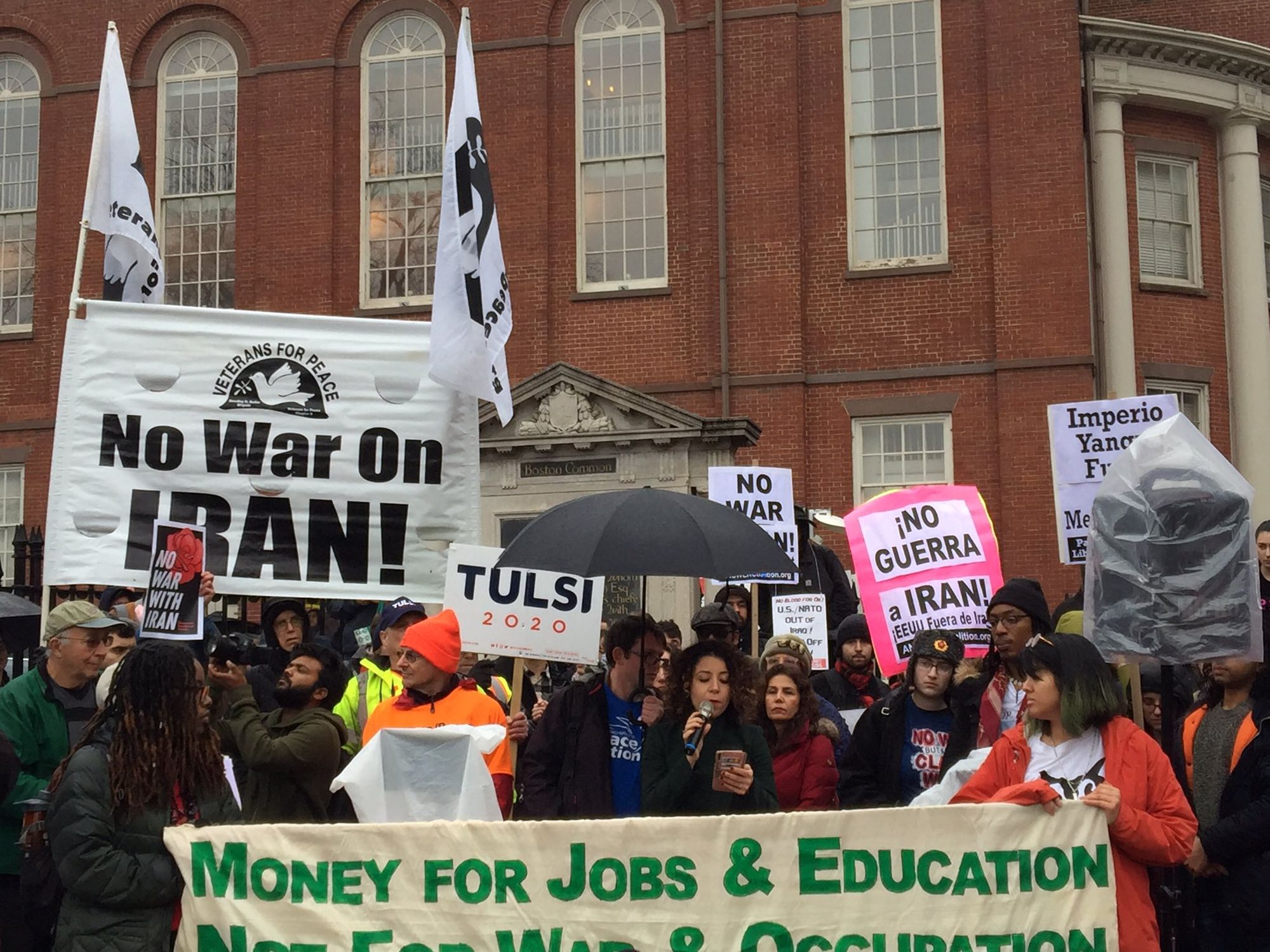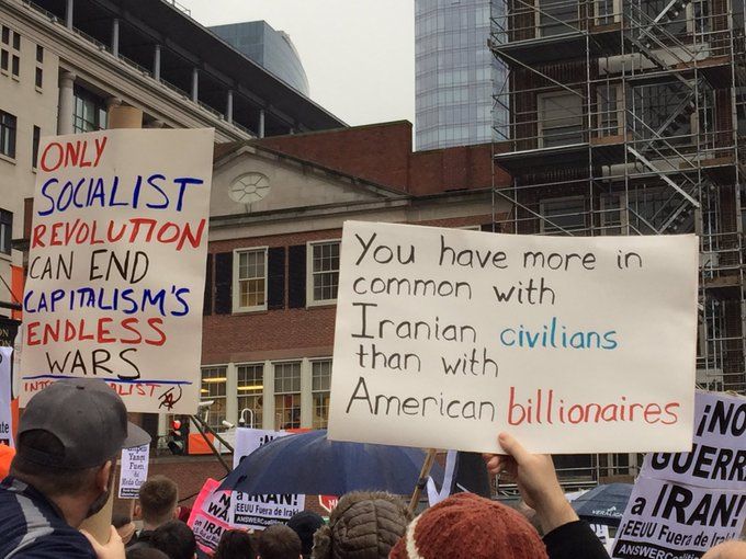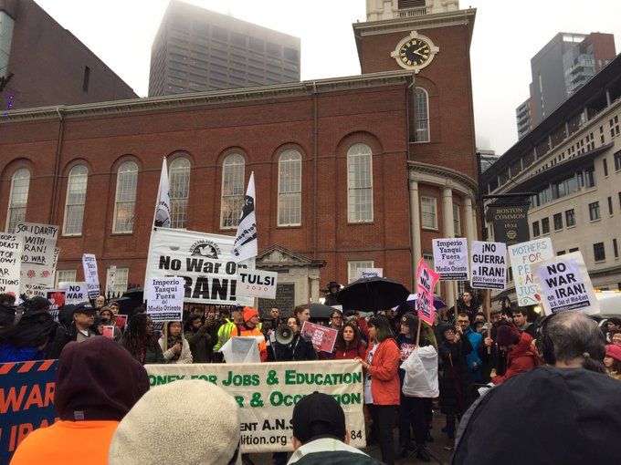 There were all manner of groups out at the protest who do good work including the Workers World Party, ANSWER Coalition, CODEPINK and others explaining the history of our disastrous meddling in the Middle East. A flier from Massachusetts Peace Action laid out our timeline of fucking things up in Iran from the CIA helping to overthrow Mosaddegh in 1953 because we and the Brits wanted that sweet sweet oil up through the seventies when we supported Saddam Hussein in the Iran-Iraq War up through the eighties when we shot down an Iranian airliner killing almost 300 civilians up to last year when Trump withdrew from the Iran Nuclear Agreement seemingly on a whim.