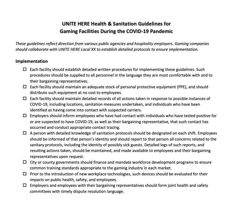 The union also more recently released pages of conditions they would like to see met before hotels can be reopened which you can see here if you like but read in part like so: