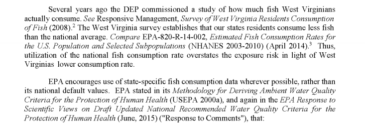 All of that is very predictable of course, but you might be surprised to hear the line of argument used by the WVMA which in essence was that since West Virginians are so fat, drink so little water, and eat so little fish compared to the rest of the country, it would be unfair to the polluting industry to hold them to the same standards in other skinnier, thirstier, fish-eating states.