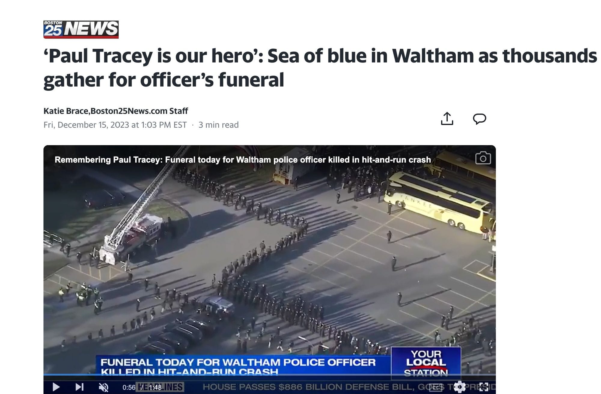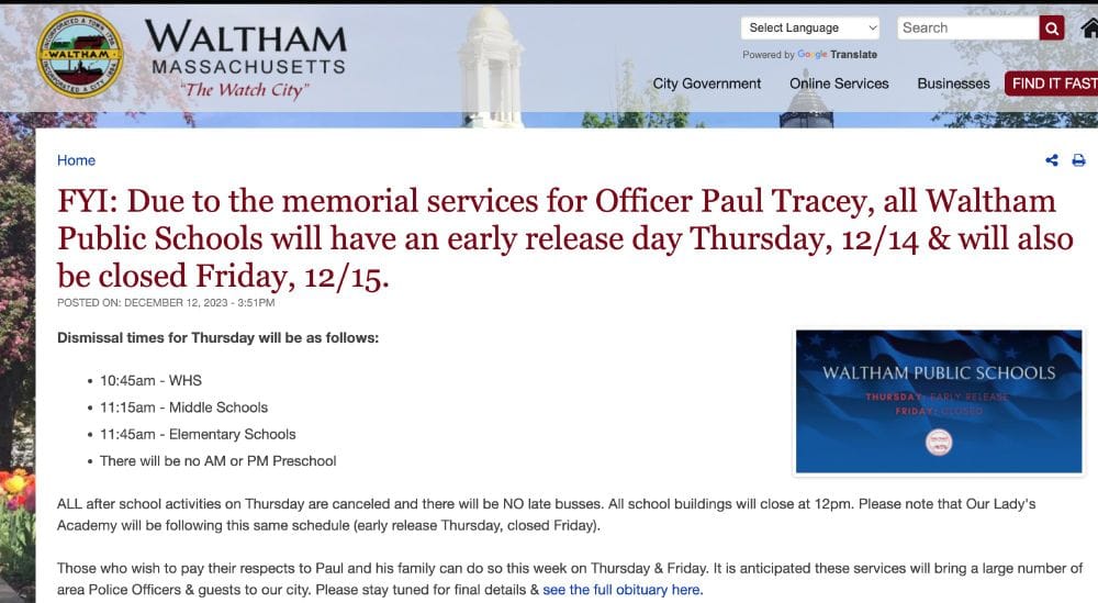 Waltham – a city of about 65,000, ten miles or so outside of Boston – closed down schools and many major roads for almost two full days because the police needed to commandeer the school buses to ship in cops and mourners from all over to attend the funeral of an officer named Paul Tracey. Tracey was killed along with a – much less mentioned in the local news – National Grid worker named Roderick Jackson when a man drove into them while they were working on the side of the road. Never let it be said that we don't have our hierarchy of citizenry in order in this country.