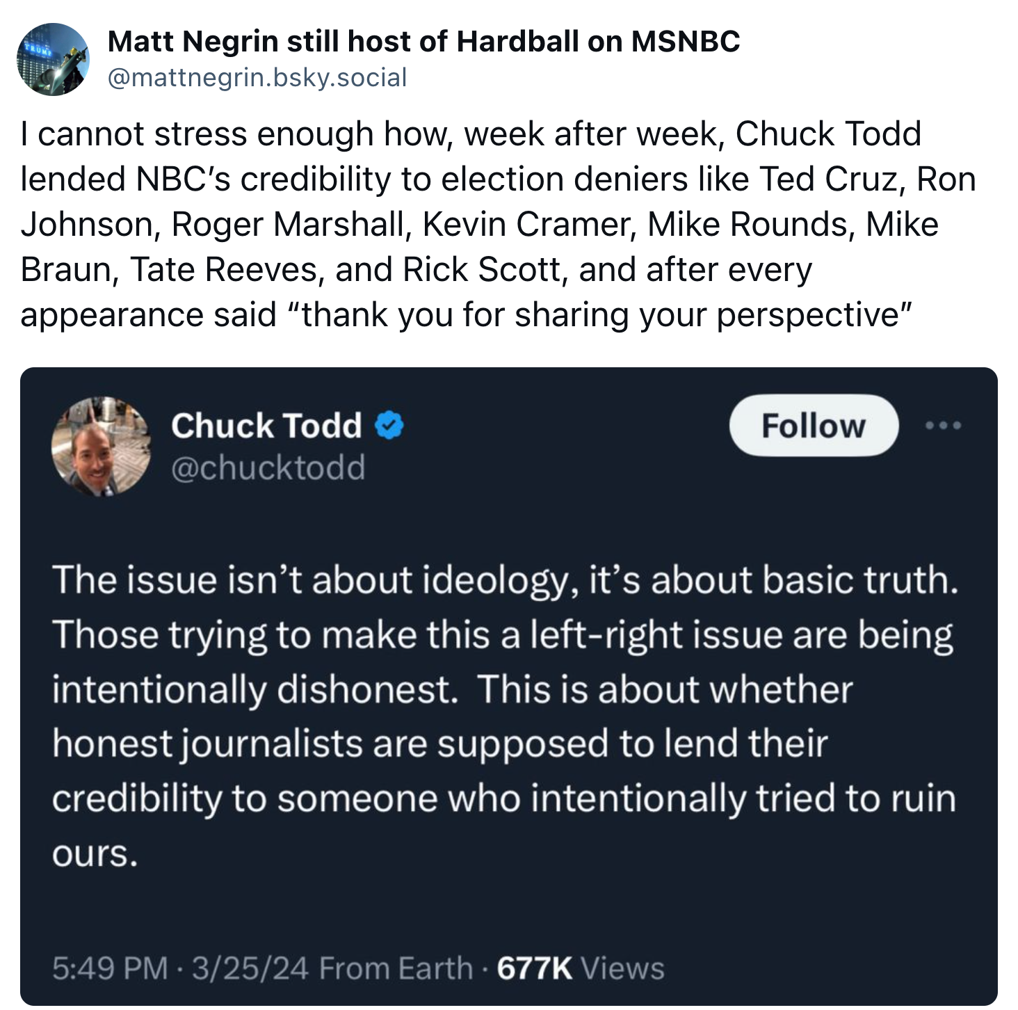 The entire thing is yet another example of how news networks and newspapers go out of their way to project "balance." No to achieve it mind you but to project it. But balance is and always has been a lie. It has nothing to do with "objectivity" – which none of these fucking places ever even approach either – and more to do with the performance of neutrality. A grim fucking pantomime of something that doesn't exist.