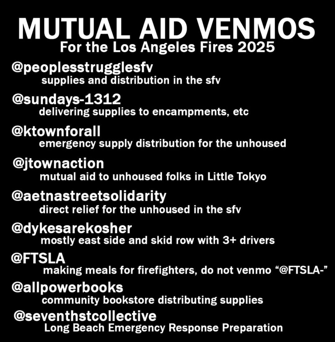 Please take a look at this lengthy list of resources compiled by Mutual Aid Los Angeles for people and animals displaced by the fires. It also includes donation and volunteer suggestions. This is a list of music industry people who have lost their homes including a number of fundraisers you might consider giving to. And here is a list of displaced Black families who can also use help.