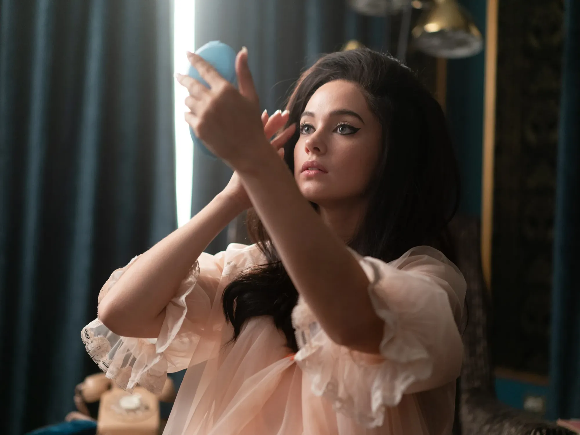 Then I watched Priscilla, Coppola’s 2023 biopic about the relationship between Priscilla and Elvis Presley, and damned if I didn’t have an epiphany. It happened early on, when a 14-year-old Priscilla Beaulieu (Cailee Spaeny) is sitting on a sofa next to 24-year-old Elvis Presley (Jacob Elordi). The two are leaning into one another without making contact. Electricity crackles between their faces. Then, Elvis touches the tip of Priscilla’s finger with his.