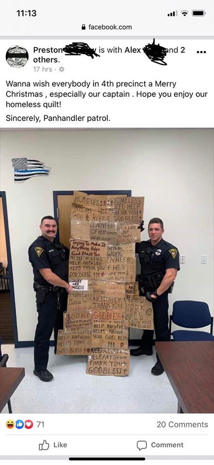 Not sure which detail here is worse the fucking blue line flag on the wall or the fact that the signs that say “Thank you and god bless” seem to be written by the same person meaning the cops went and stole their sign once then they made another one only to have it stolen by the cops again.