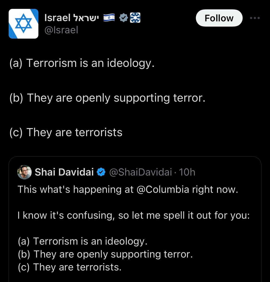 The statement—which, in context, implicitly calls for violence against Columbia students—merely copies the one in the original post by Zionist agitator Shai Davidai. Both the State and its minion are wrong.